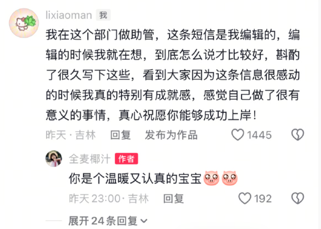 记者注意到,在社交网站上,很多同学发布短信截图表示非常感动,还有人刷到短信后感觉很温暖。