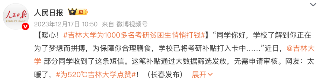 不仅仅是吉林大学,据媒体报道,12月1日,安徽师范大学悄无声息地向家庭经济困难的考研学生们发放了一份特殊的补助,有人收到了300元,有人收到了650元。