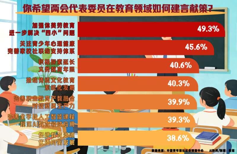 全国两会上,教育作为重要的民生议题,引发广泛的关注与讨论。近日,一项有1998名受访者参与的两会期待调查显示,在教育领域,青少年身心健康成长备受关注,其中近半数(49.3%)受访者期待加强体美劳教育,进一步解决青少年“四小”(“小眼镜”“小胖墩”“小豆芽”“小焦虑”——记者注)问题;45.6%的受访者关注青少年心理健康,期待完善家校社联动支持体系。