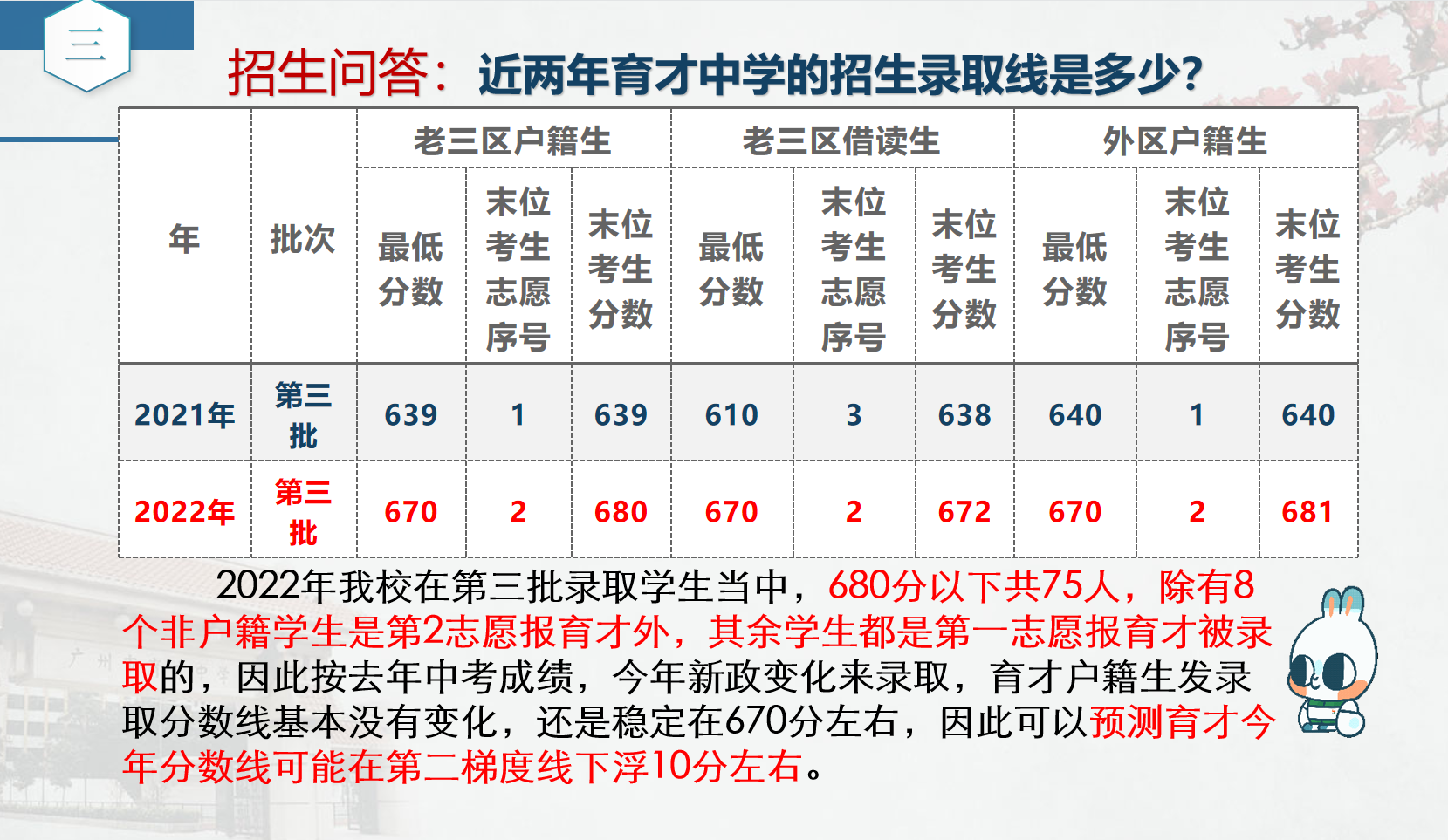 根据近两年录取情况和今年第一梯度线比例由全市12%比例提升到9%的变化,钟伟林建议,680分以上的考生在第三批次第一志愿大胆报考育才中学,力争进入学校红棉班,“希望690分以上的考生能第一志愿报考育才中学,力争就读‘红韵班’。”