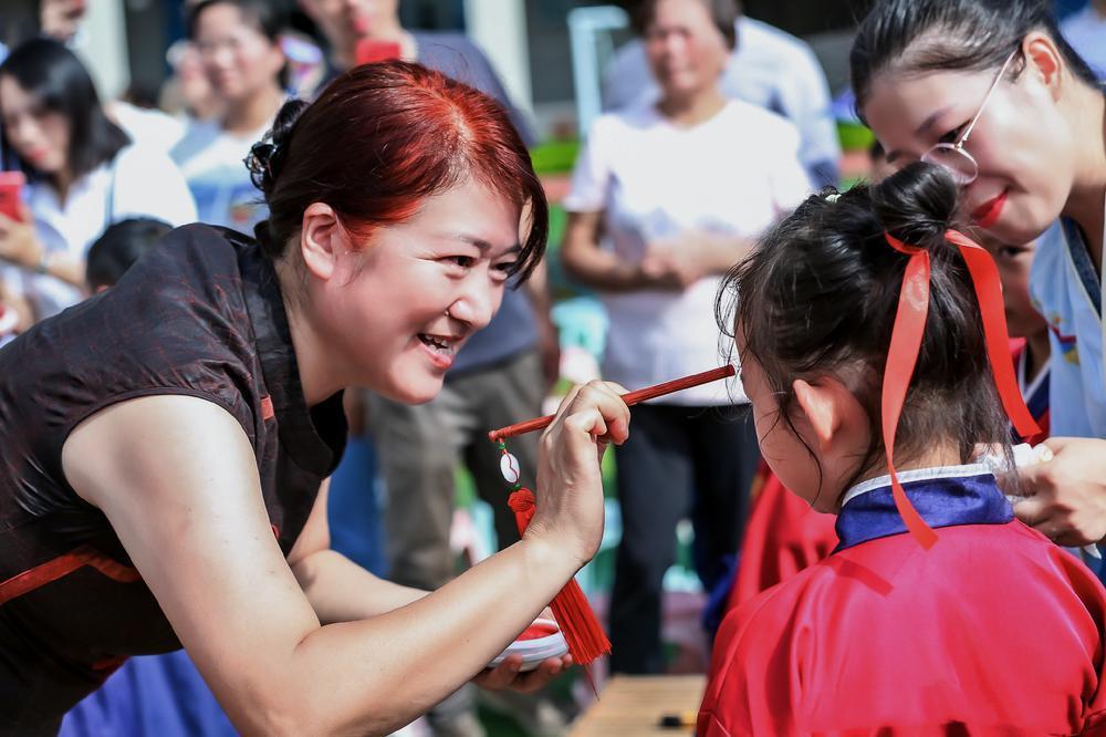 点朱砂又称“开天眼”,一颗颗朱砂红痣,点在学子们的双眉之间 、正眉心处,代表的是给每一位学子开启智慧 。