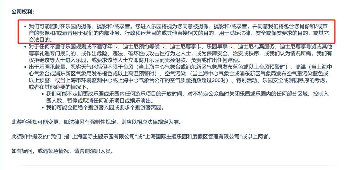 24日,记者查阅了北京、上海、广州三地多家知名乐园的官网,发现这些乐园均有对使用游客个人信息的相关规定。其中北京一家知名度假区的入园须知称,“我们可能在度假区内摄像、摄影和/或录音。您进入度假区将视为您同意被摄像、摄影和/或录音,并同意我们将包含您肖像和/或声音的影像和/或录音用于我们的业务、行政和运营目的或其他直接相关的目的,用于满足法律、安全或保安要求的目的,或其他合法目的。”在上海迪士尼“游客须知”中有类似表述的规定。