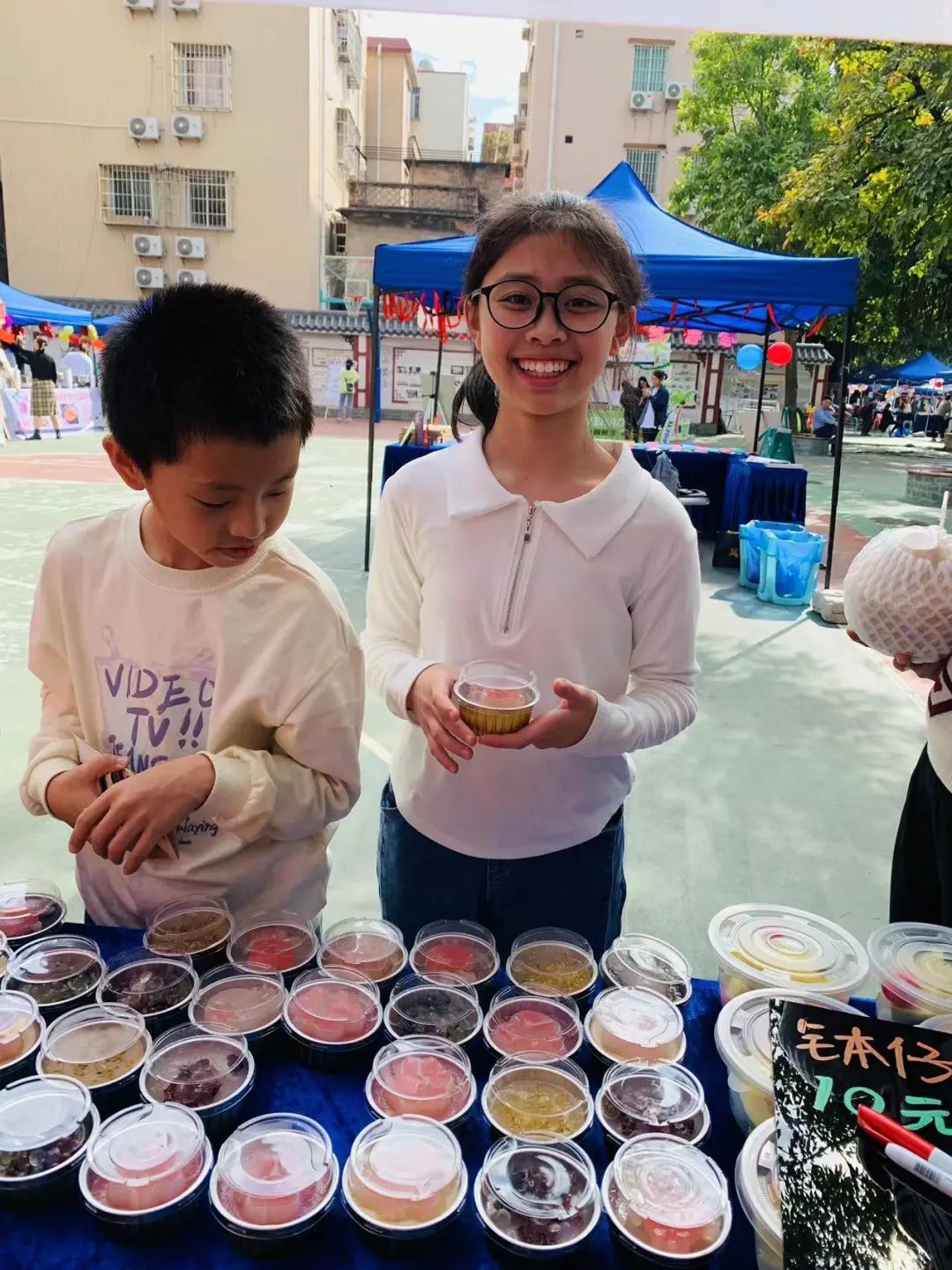 正所谓“食在广州”,活动现场气氛热烈。最热闹的要数一年级的摊位,凉粉、砵仔糕、马蹄糕等广州传统小吃颇受欢迎。一年二班的学生家长刘女士告诉记者:“我们家长中有烘焙爱好者,由她牵头组织我们一起准备材料,从准备食材到制作,我们大概花了一周时间,做的都是常见的但是又有代表性的广式小吃,比如斑斓凉粉,砵仔糕等等,小朋友们也玩得很开心。”