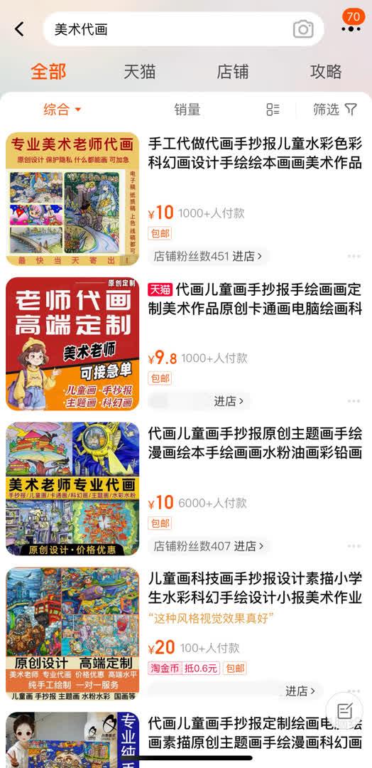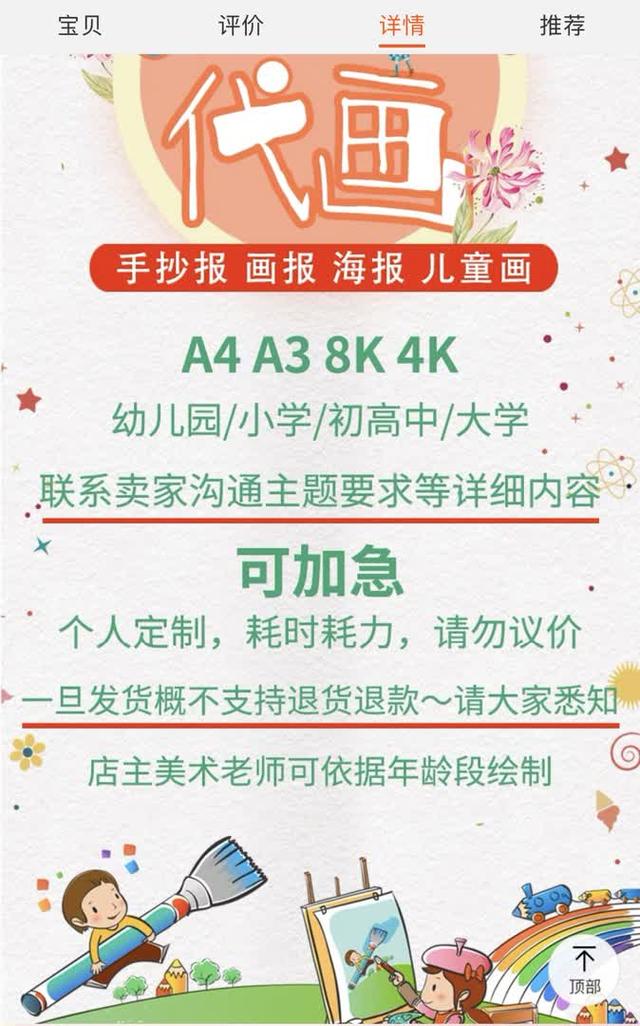 “老师代画,高端定制,手抄报、儿童画、科幻画、主题画……”在一家工作室的店铺里,商家声称“幼儿园到大学,什么都能画,原创设计,可加急,最快当天寄出。”从销量来看,代画已售超过3万件。