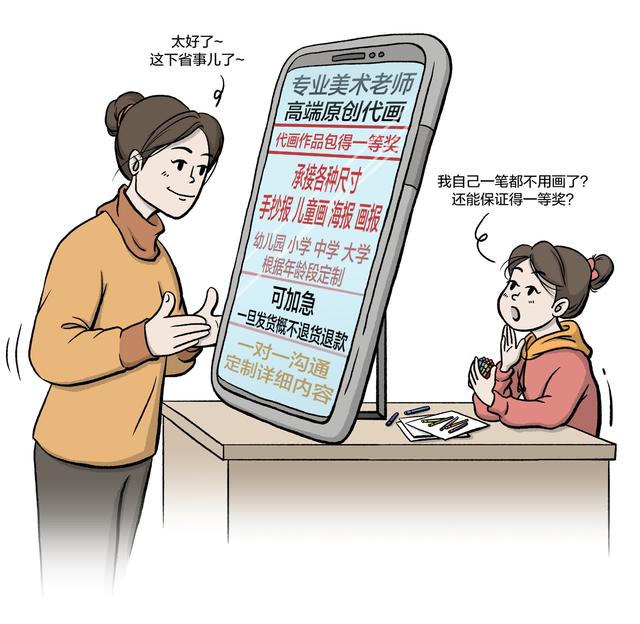 “现在从手抄报到美术比赛都越来越卷,孩子辛辛苦苦画半天,也还是跟那些找专业老师代画的没办法比。眼看别人花钱买来的作品最终拿大奖,孩子心里肯定不平衡。”作为家长,程女士对代画行为极力反对,“这样下去,只会让学生和家长的负担越来越重。如果找‘枪手’才能获奖,那比赛也就失去了意义。”