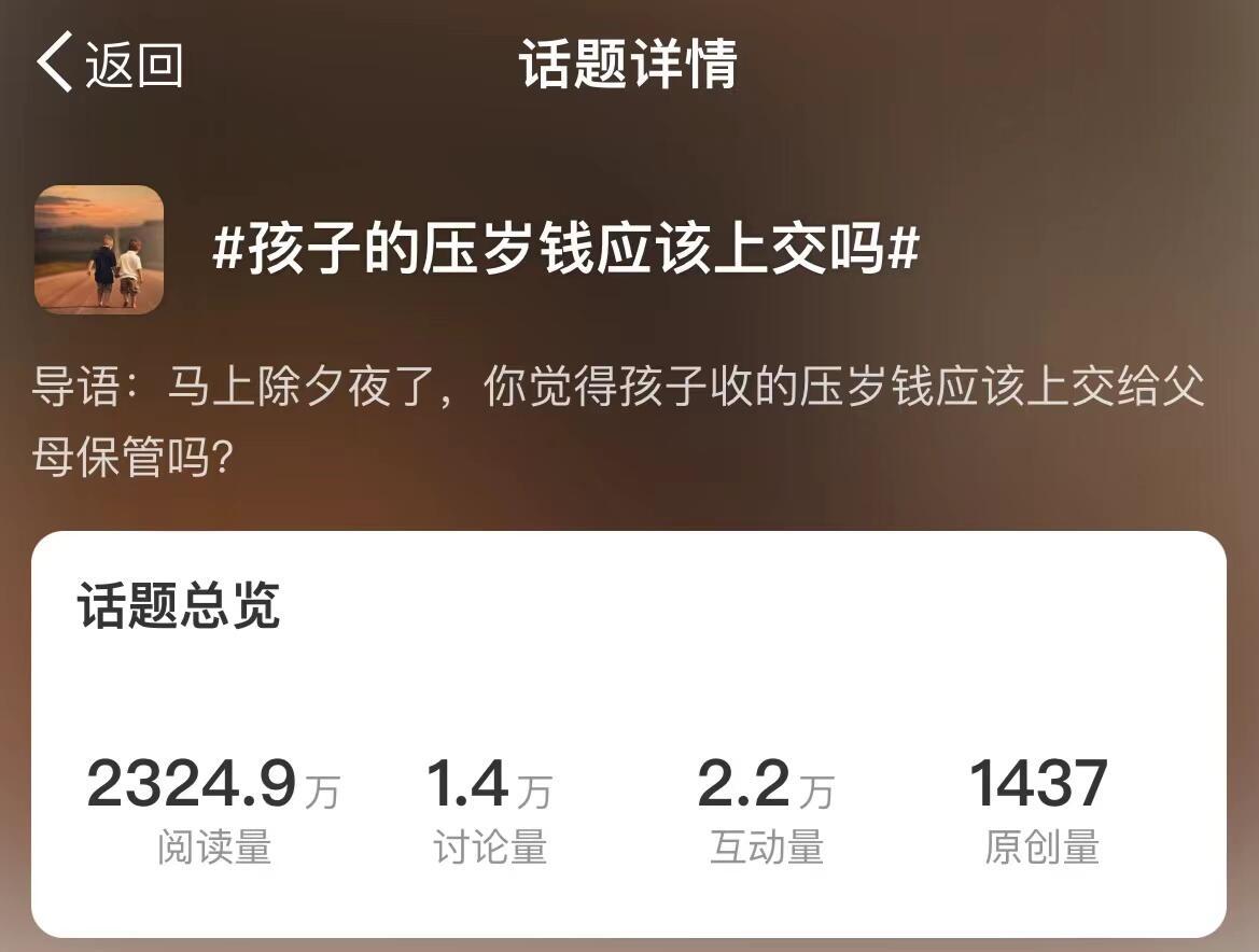 过完年,孩子们收到的“大包小包”压岁钱怎么支配?“我们先帮你保管,等你长大了再还给你。”这样的话你是否耳熟?近年来,随着压岁钱金额的逐年上升,#孩子的压岁钱应该上交吗#等话题也由此频频引发热议。今年春节期间,杭州一位三年级小学生攒下70万压岁钱的消息就冲上热搜,引发更多人对于管理压岁钱的思考。