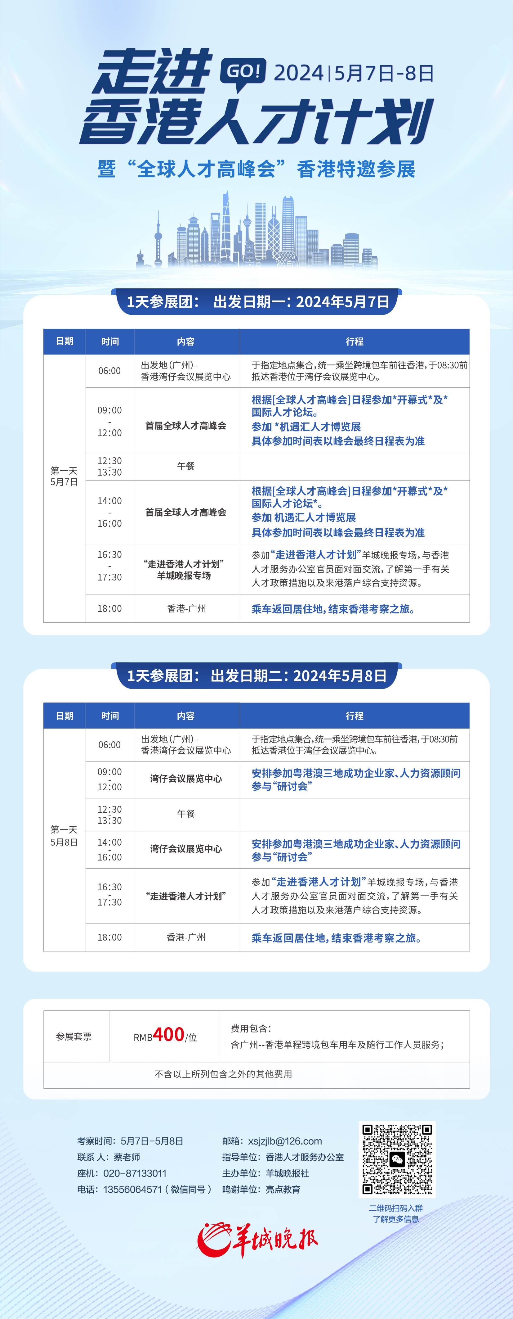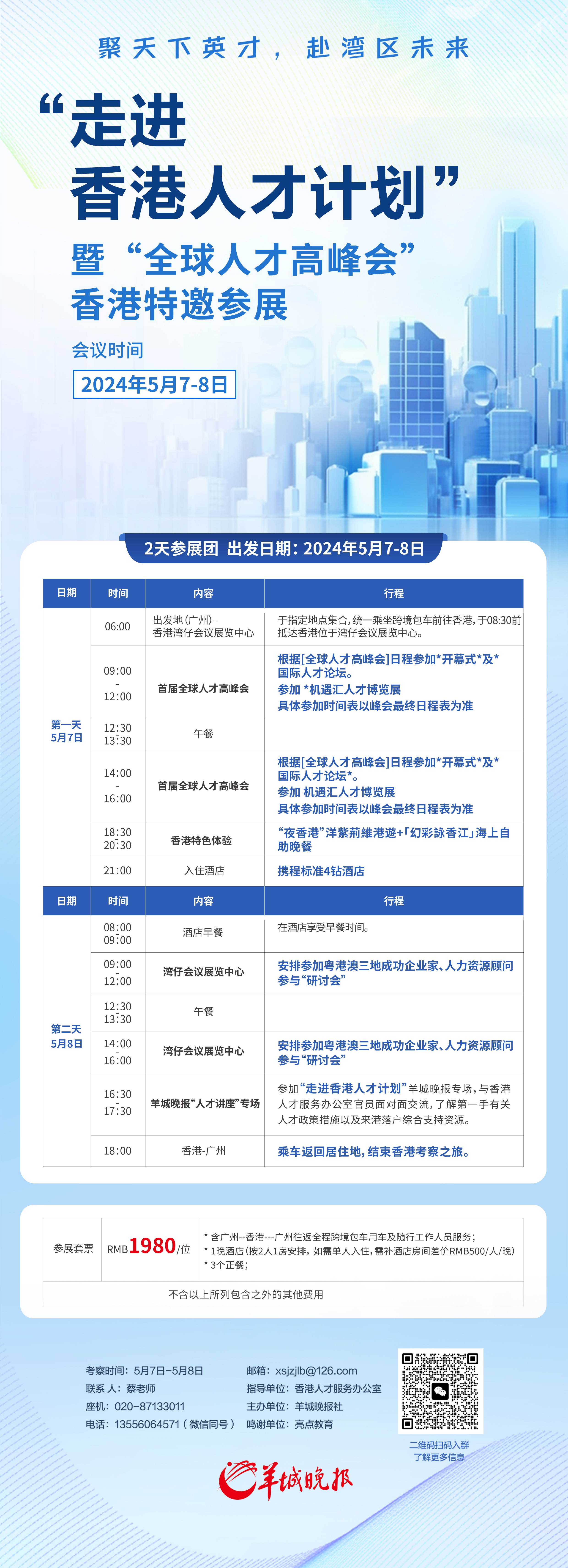 在一天行的行程中,5月7日的团员可以选择参加首届全球人才高峰会和国际人才论坛。5月8日的团员则可以选择参加“第二届粤港澳大湾区人才高质量发展大会”和粤港澳企业家、人力资源顾问研讨会。两天的行程中均安排了“机遇汇人才博览展”和“走进香港人才计划”羊城晚报专场等重磅活动,将有机会与大咖同台,与成功人士同道,了解第一手人才政策以及来港落户综合支持资源等。