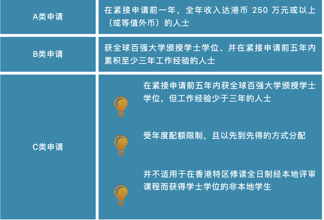 如果你是高学历或高收入人士,那么可以考虑申请高才通计划。申请者提出申请时无须已在香港觅得工作,申请批准后,可获准在港逗留 24 个月而不受其他逗留条件限制。