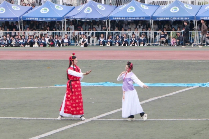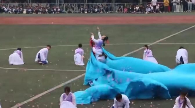 4月28日,枣庄学院春季运动会开幕,48位学生表演的《红楼一梦》在短视频平台“美”出了圈。表演以越剧开头,融合古典舞和摩登舞,最后宝玉托举着黛玉站在风中,曲终时四周被拉开的蓝布包裹着花瓣弹向两人,宛若黛玉的裙摆,也似宝玉的披风,但最终还是滑落在地,看到这一幕网友纷纷大呼“美!”