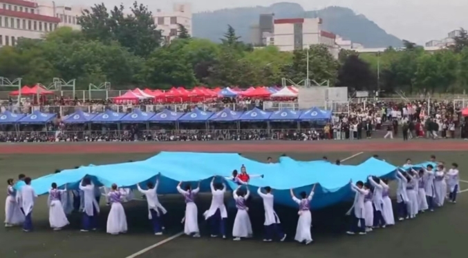 4月28日,枣庄学院运动会开幕式表演的《红楼一梦》在短视频平台“美”上了热榜。29日,负责编舞的该学院老师武培告诉记者,这一节目48位参演者均来自体育舞蹈专业,排练历时一个月,现场的演出是自排练以来最好的一版,受到大家的喜爱意外又欣慰。该演出融合了越剧、古典舞、摩登舞等元素,还设计了贴近《红楼梦》情节的桥段,比如用一块两百多平方米的蓝布收集花瓣演绎“黛玉葬花”。