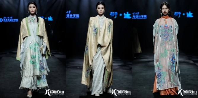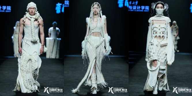 本次毕业展演以“未•时尚24”为主题,汇报共展出118套服装,分为“新生”“衍生”“创生”“共生”四个章节。同学们围绕文化传承、都市潮牌、时尚科技三大设计主题,采用光感纤维、可穿戴声控感应服装、多层不同功能复合材料,将编织、刺绣、植物染等传统手工艺与现代时尚相结合。