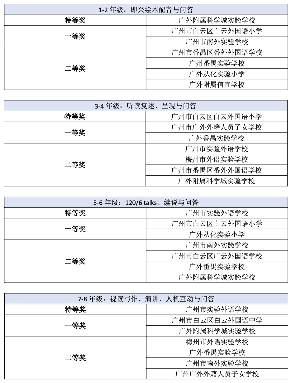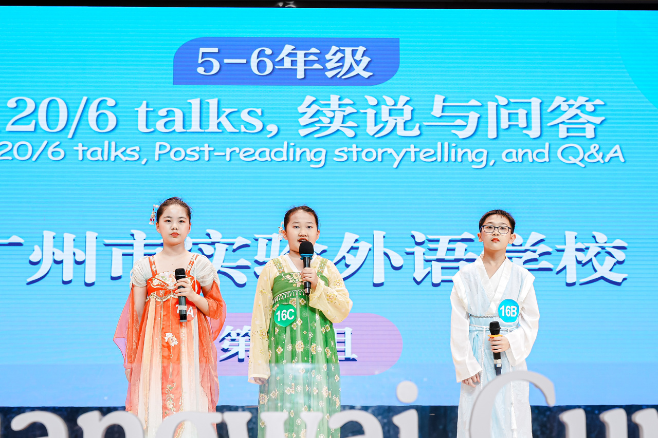 据悉,本次比赛按年级分组,1-2年级组为即兴绘本配音与问答;3-4年级组为听读复述、呈现与问答;5-6年级组为限时talks、续说与问答;7-8年级组为视读写作、演讲、人机互动与问答。