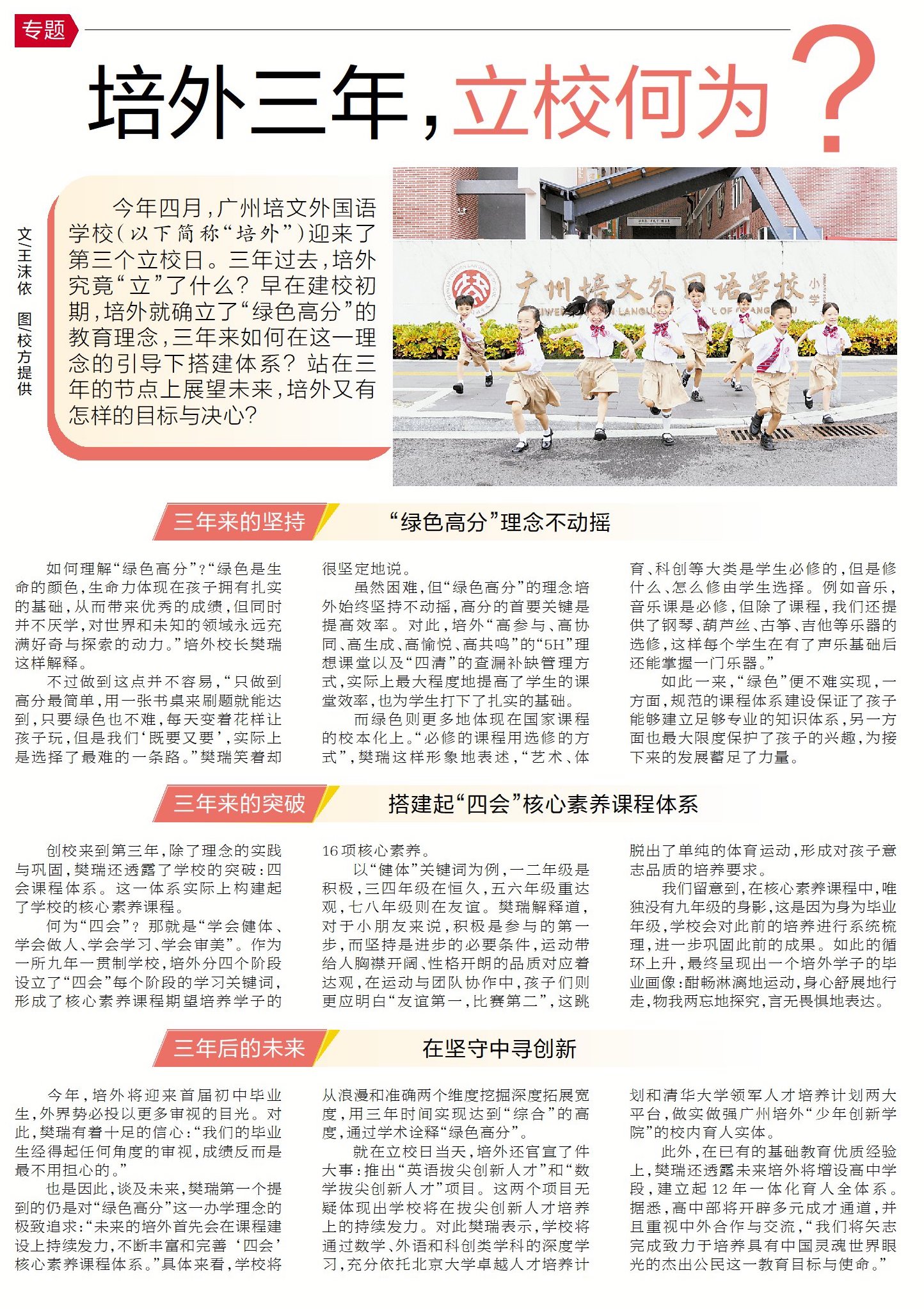 今年四月,广州培文外国语学校(以下简称“培外”)迎来了第三个立校日。三年过去,培外究竟“立”了什么?早在建校初期,培外就确立了“绿色高分”的教育理念,三年来如何在这一理念的引导下搭建体系?站在三年的节点上展望未来,培外又有怎样的目标与决心?