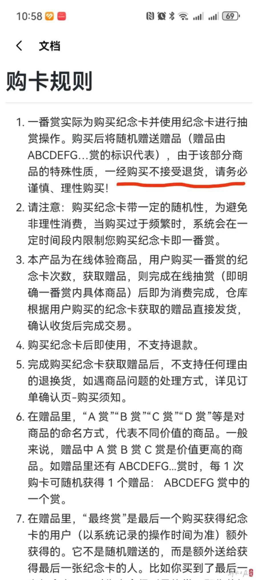 在赵先生儿子下单的千岛App店铺“AG潮玩”店,记者看到,店铺对于“抽赏”行为介绍称,“本产品为在线体验商品,用户购买一番赏的纪念卡次数,获取赠品,则完成在线抽赏(即明确一番赏内具体商品)后即为消费完成,仓库根据用户购买的纪念卡获取的赠品直接发货,确认收货后完成交易。”