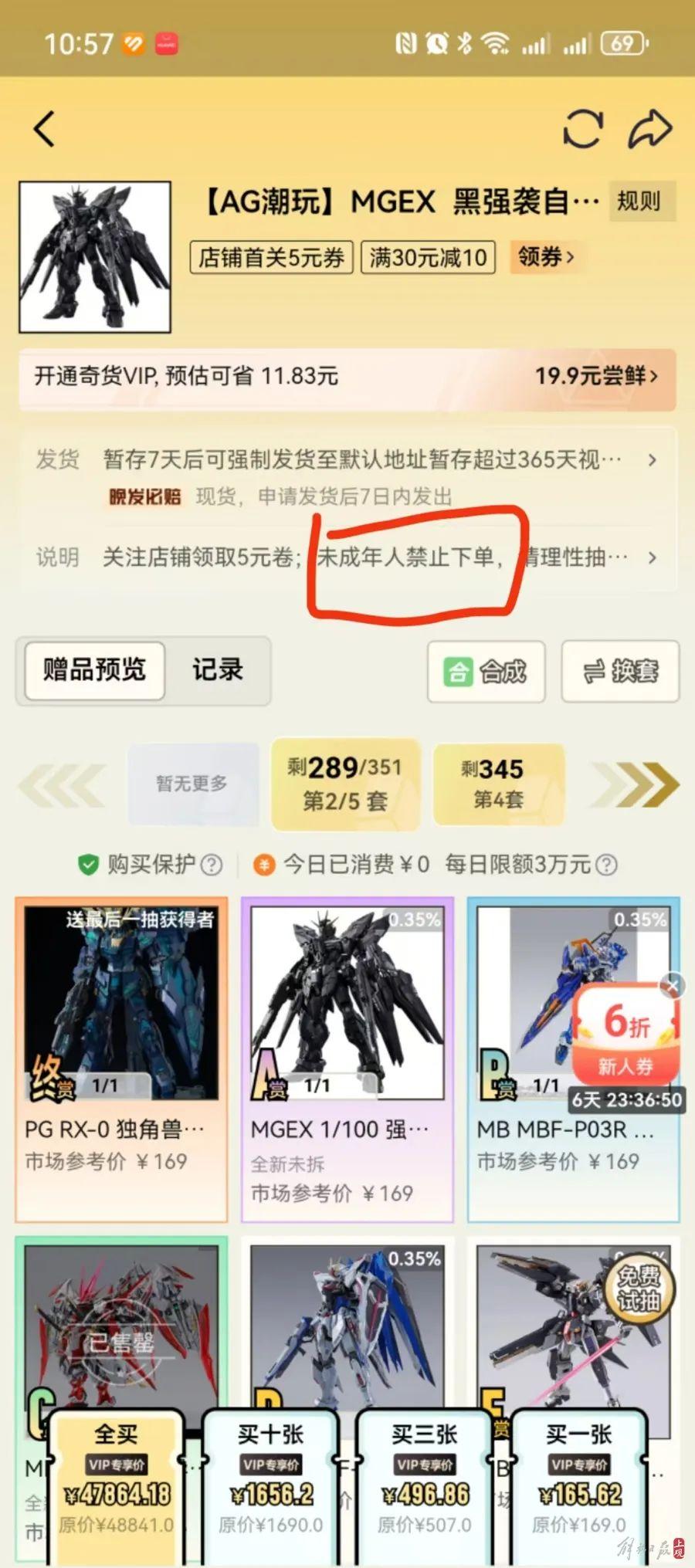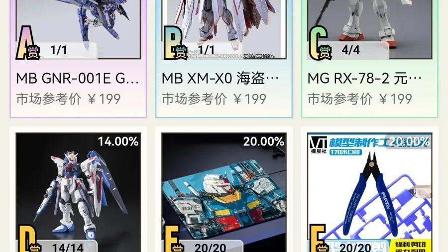 记者点击进入“马甲E”的界面,主页显示,消费金额每日限制3万元。赠品中,一共有A、B、C、D、E、F、G和H赏8种赠品,市场参考价均标199元。但实际上,赠品A赏是流通价格5000多元的“MBGNR-001EGNArmsE型”,B、C、D赏也是高达模型,流通价格分别是2000元、200元和100余元。其余赏赠品无流通价格,记者在其他平台搜索相关产品,市场价仅为几块钱至数十块钱。