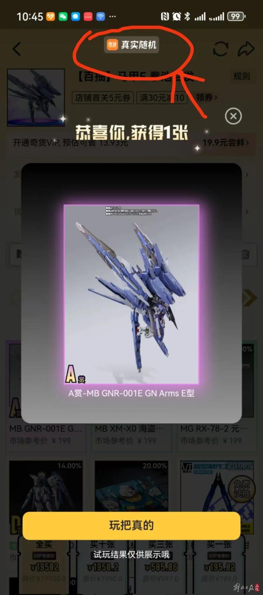 页面上还提供了“免费试抽”按钮,记者注意到,试抽页面上方显示“奇货真实随机”,记者仅仅试抽了6次,竟然3次抽到了A赏的高达模型,显然不符合100抽仅有1个A赏的概率,是一种诱导下单的手段。