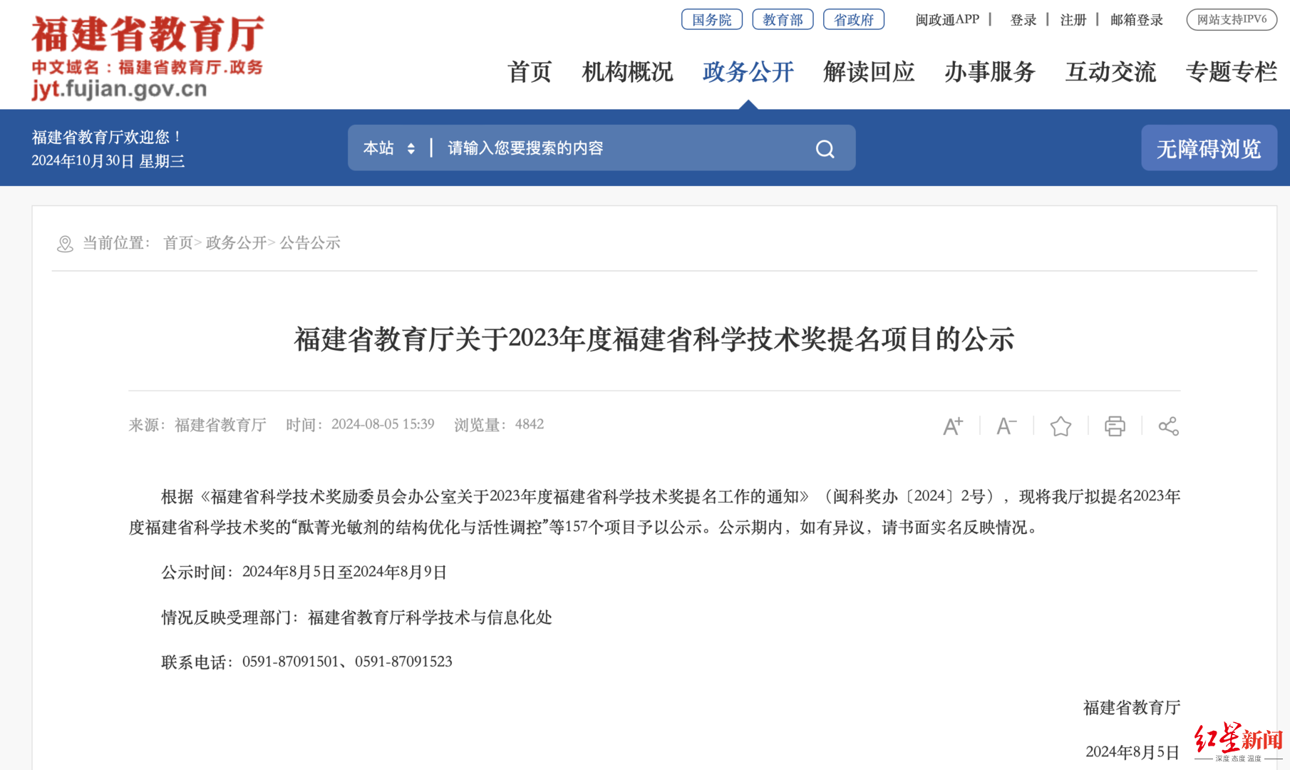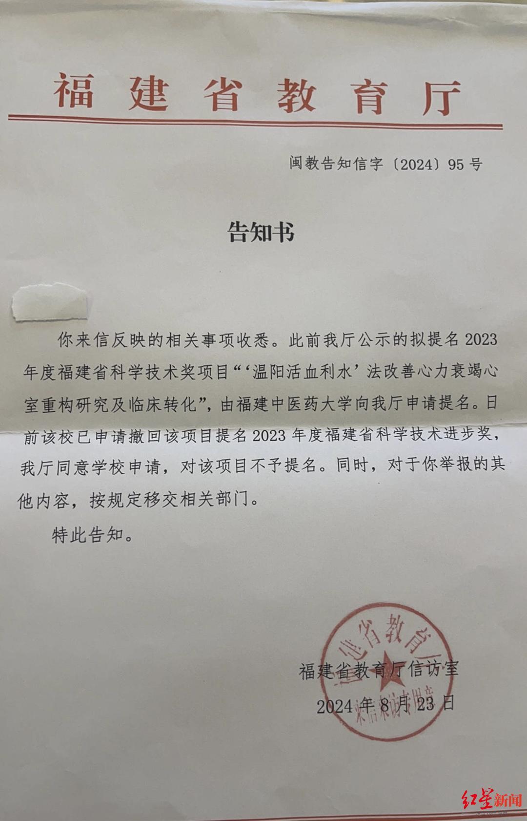 该医生提供的一份福建省教育厅回复告知书称,“你来信反映的相关事项收悉。此前我厅公示的拟提名2023年度福建省科学技术奖项目‘温阳活血利水’法改善心力衰竭心室重构研究及临床转化,由福建中医药大学向我厅申请提名。日前该校已申请撤回该项目提名2023年度福建省科学技术进步奖。我厅同意学校申请,对该项目不予提名。同时,对于你举报的其他内容,按规定移交相关部门。”该告知书落款时间为2024年8月23日。