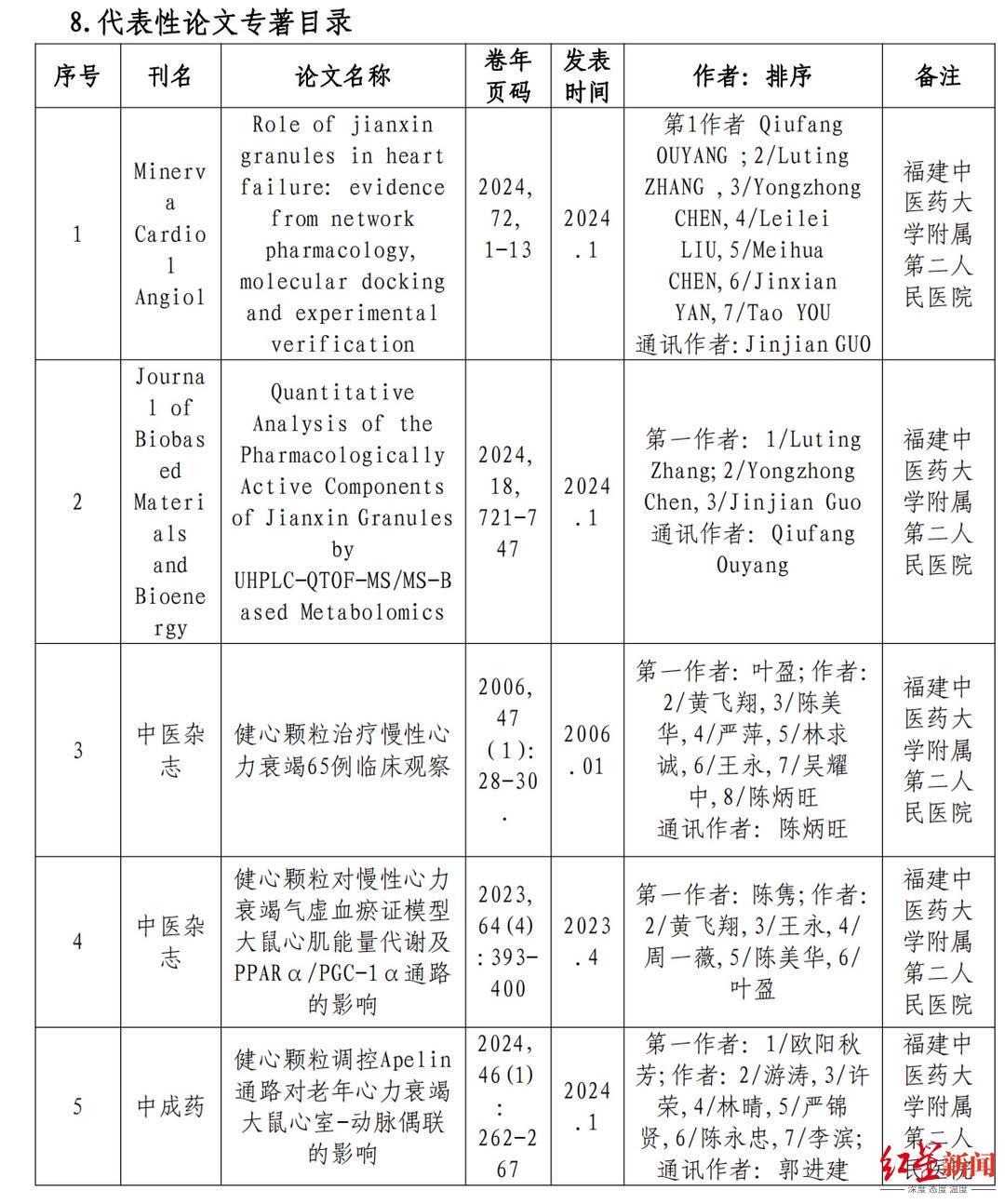 其余九人贡献均为“项目实施者”,如“开展相关临床研究”“对产品全程整体质量控制”等。在项目代表性论文专著目录中,共有五篇论文,最早一篇发表于2006年1月,其余多发表于2024年1月。记者注意到,五篇论文的作者和通讯作者中均未有赵某某的名字。