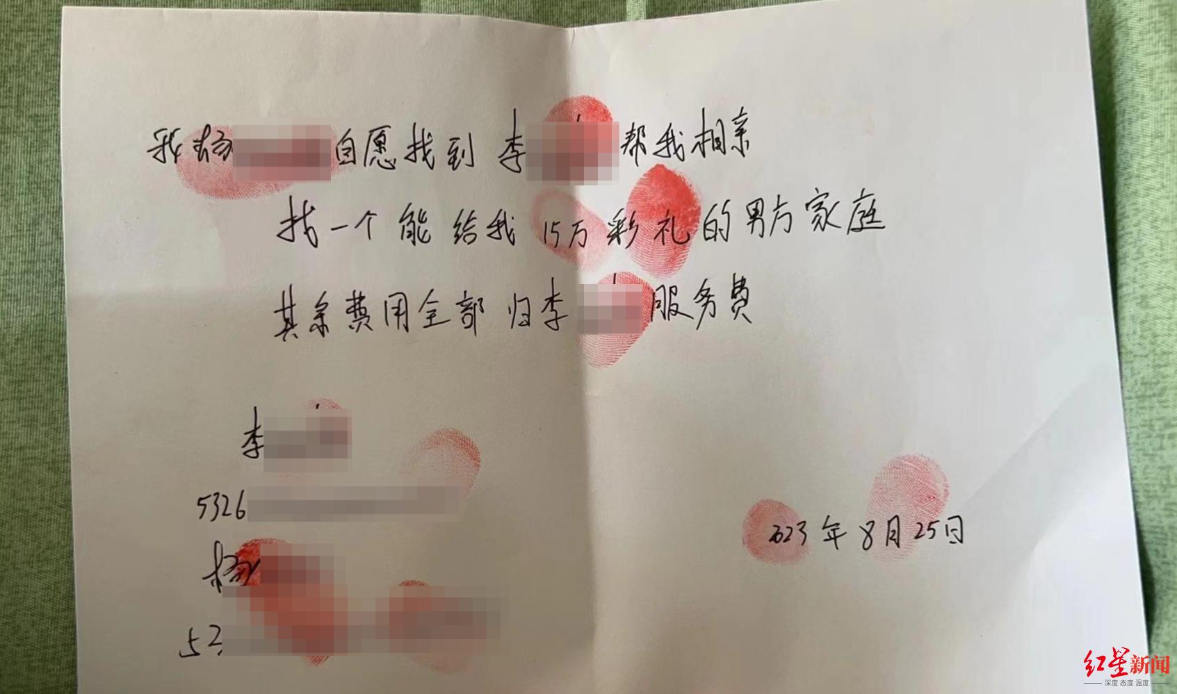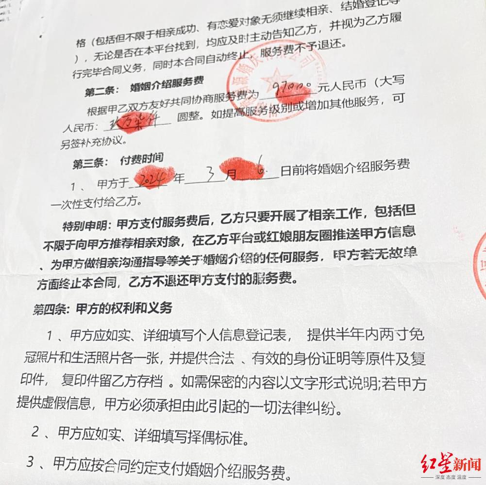 女孩子提供的婚检报告是前几天的。“问完女方要多少彩礼,就让我们交中介费签合同。”小曾说,条款都是对中介有利的,后面发生什么纠纷跟中介没关系。