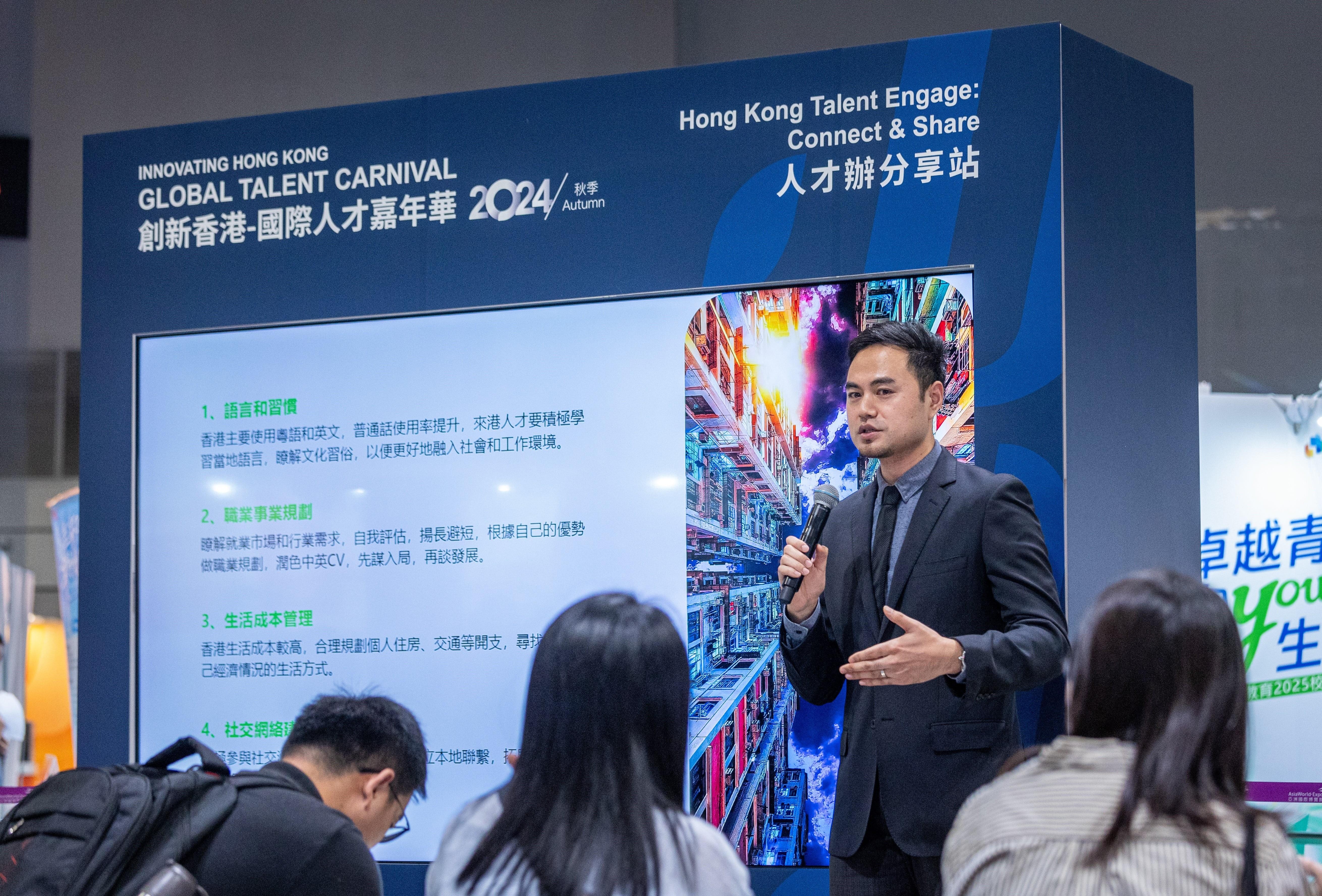 除了丰富的招聘岗位,香港人才办设置“分享站”,邀请多位行业专家讲解人才求职攻略,分享人才在香港生活和工作的经验,探讨香港与外地的职场文化差异,并且有专人提供咨询服务。