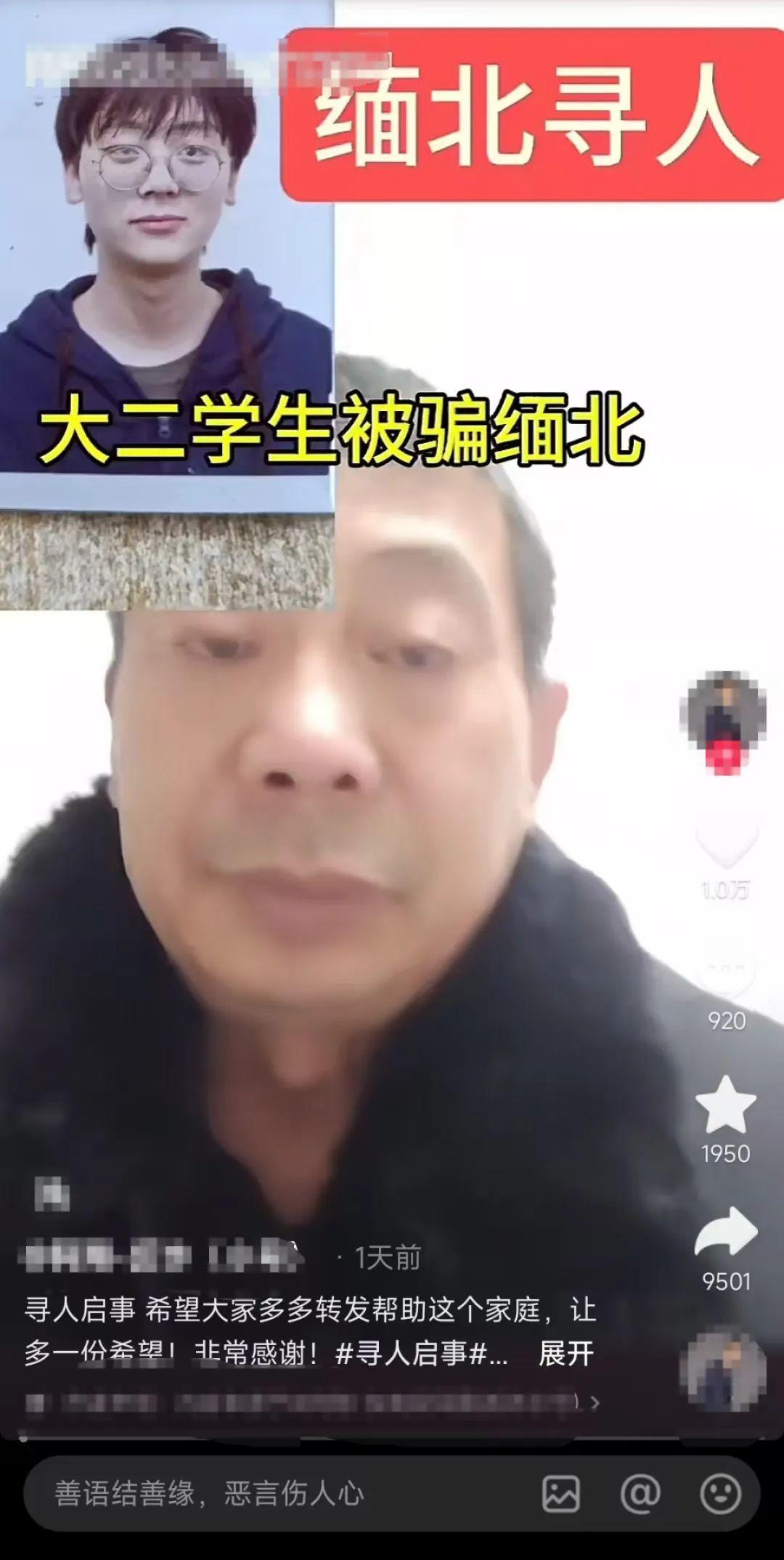 日前,一段河南父亲流泪寻子的视频在网上热传,引发关注。视频中,这位父亲称自己儿子李某在辽宁上大学,今年9月份瞒着家里找工作后失联,他怀疑自己儿子被骗到了缅甸。