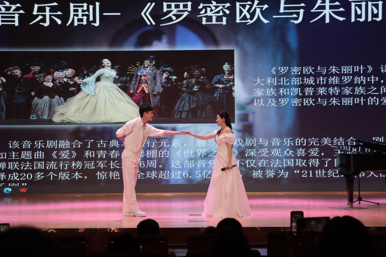 莎士比亚的经典悲剧《罗密欧与朱丽叶》被改编成无数艺术作品,本次分享会便呈现了歌剧和音乐剧两种不同艺术形式的精彩演绎。曾婧莹老师以其甜美而富有穿透力的歌声,演绎了歌剧版朱丽叶的经典唱段《我愿生活在美梦中》,将朱丽叶对爱情的憧憬与无奈展现得淋漓尽致。而邱思晖老师和杨超老师则演绎了音乐剧版本中罗密欧与朱丽叶的经典对唱《阳台》,将这对恋人之间爱恨交织的复杂情感表现得扣人心弦。