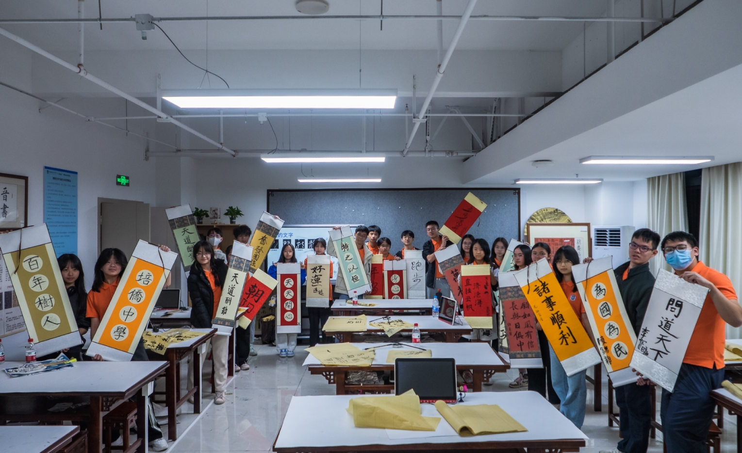 同学们还沉浸式体验了一把广东财经大学课堂是如何教学的。活动邀请了艺术与设计学院教师谢玉婷、徐保民进行授课,谢玉婷老师为同学们讲解了“蓝晒”的历史由来、制作原理和实操技巧,并演示了蓝晒作品的制作步骤,与大家一起探索阳光下的魔法——蓝晒作品创作;徐保民老师则带领同学们一起学习传统毛笔书法,通过执笔、运笔、点画、结构、布局等,讲解了中国书法的笔法、结构和章法,还为同学们准备了国风小卷轴,逐一指导大家用毛笔在卷轴上写下励志的诗、词、句,表达自己的美好愿景,同学们充分感受了中国传统书法文化的美妙。
