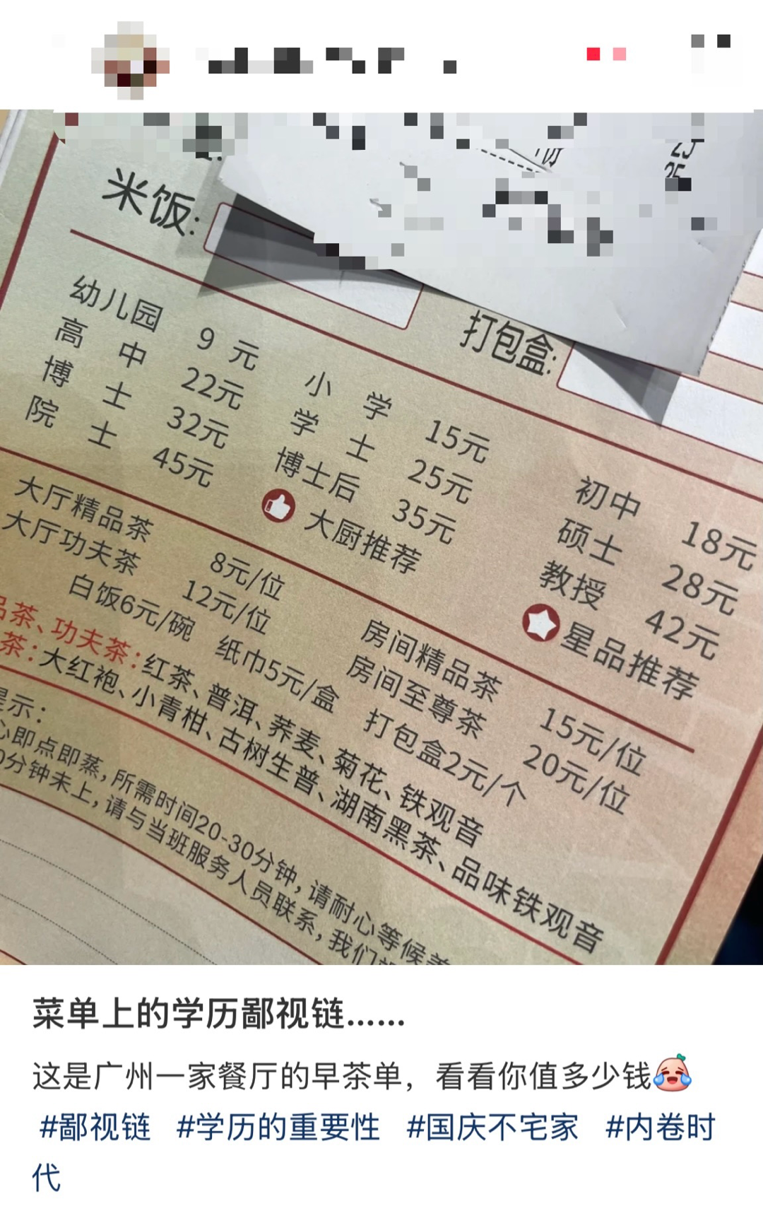 一餐厅用学历标记价格引发热议