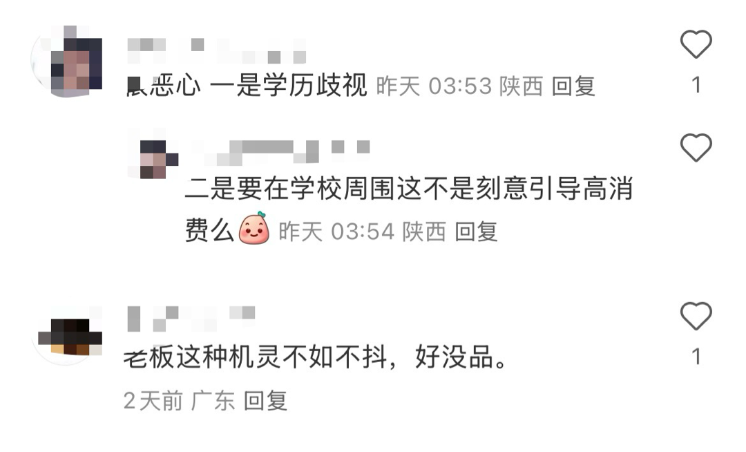 该网友谈到,店家让众网友不舒服的地方在于其把学历划分为“三六九等”,提倡“学历高、价值贵”的刻板理念,让一些低学历消费者“既花了钱,又伤了自尊”,而一个人真正的价值不应该被一纸文凭所定义。