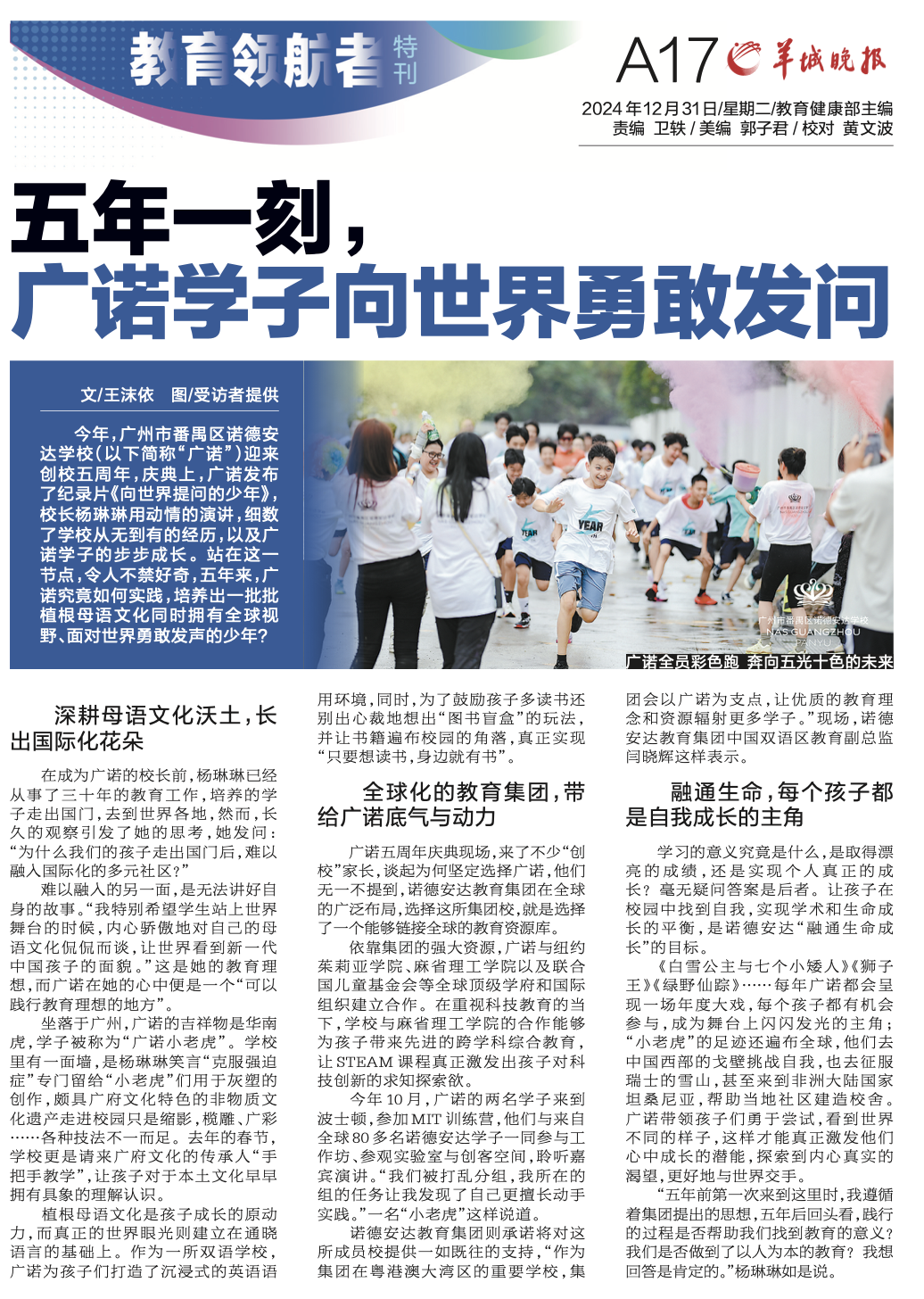 今年,广州市番禺区诺德安达学校(以下简称“广诺”)迎来创校五周年,庆典上,广诺发布了纪录片《向世界提问的少年》,校长杨琳琳用动情的演讲,细数了学校从无到有的经历,以及广诺学子的步步成长。站在这一节点,令人不禁好奇,五年来,广诺究竟如何实践,培养出一批批植根母语文化同时拥有全球视野、面对世界勇敢发声的少年?