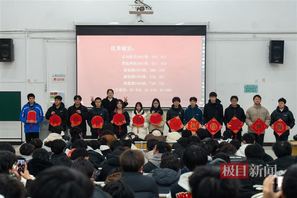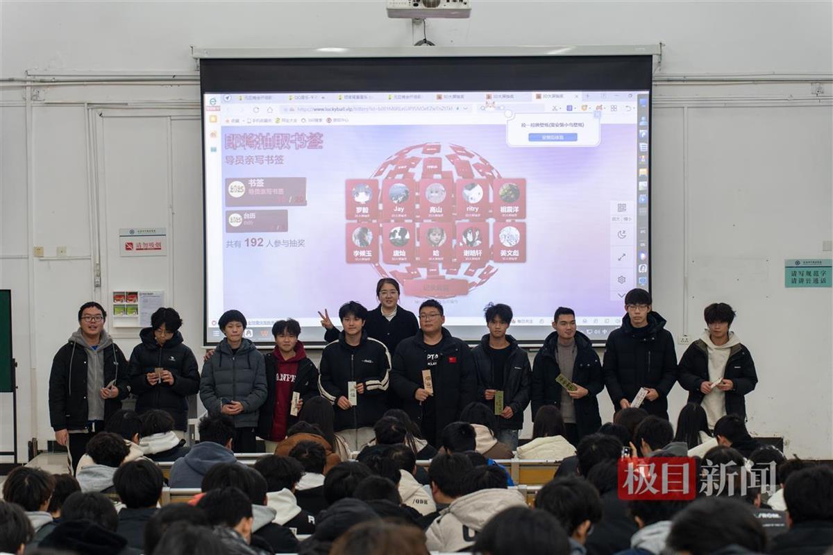 国风“惊喜”2024年12月29日晚,期末考试临近,方老师照例在教室里进行晚点名。此时,投影PPT突然开启了摇一摇抽奖,一场国风“惊喜”就此上演。“没烦恼”“不‘蕉绿’”“逢考必过”……随着结果揭晓,22名幸运同学依次上台,从方老师手中接过承载着满满心意的精美手写书签;与此同时,在这元旦佳节之际,方老师还特别给学生宿舍写了13张寓意吉祥的福字,装点出新年的祝福与好运。