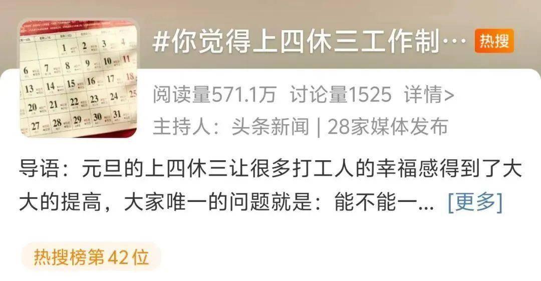 最近几日,“上4休3”的相关话题词持续登上热搜,引发网友热议。