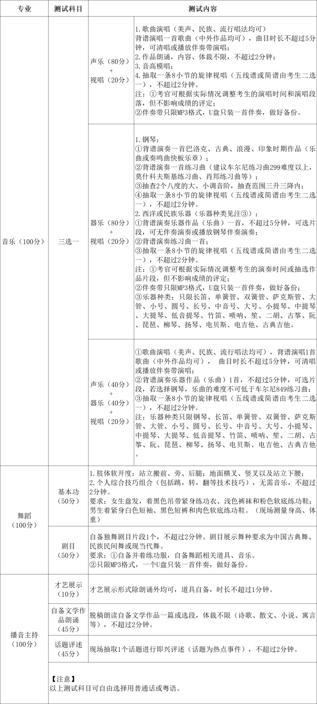 此外,音乐、舞蹈、播音主持三个专业的测试总分均为100分,60分及以上为合格。具体测试内容和要求详见学校发布的大纲。