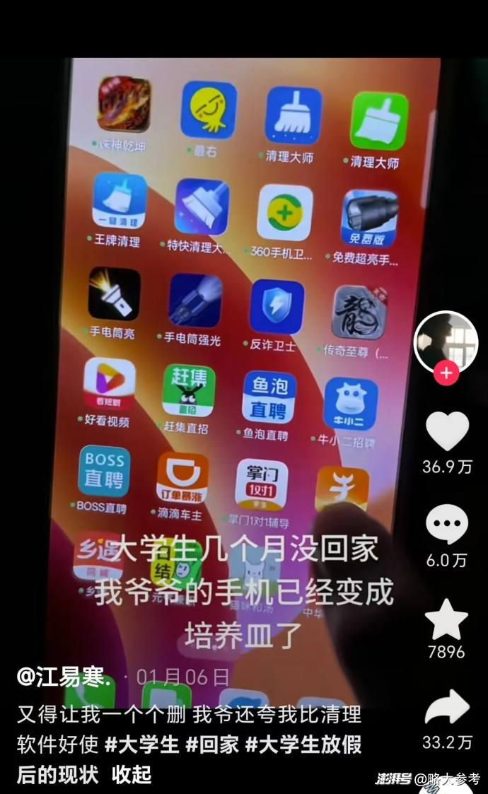 因为两部手机的内存都只剩下10%。他花费一整个上午,卸载了奶奶手机上的130个APP,并给两部手机都安装了可以跳过广告的APP,但几天后,两部手机上还是多出了十几个新软件——爷爷奶奶已经养成每天在视频软件看广告赚钱的习惯,关闭弹窗时经常误触,导致下载了广告中的软件。