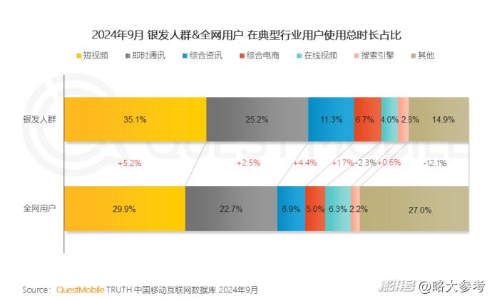 刷短视频、资讯类软件是首选,《2024银发人群洞察报告》指出,银发人群使用总时长占比最高的三个行业分别是短视频、即时通讯、综合资讯,其中短视频和资讯的占比达到35.1%和11.3%。