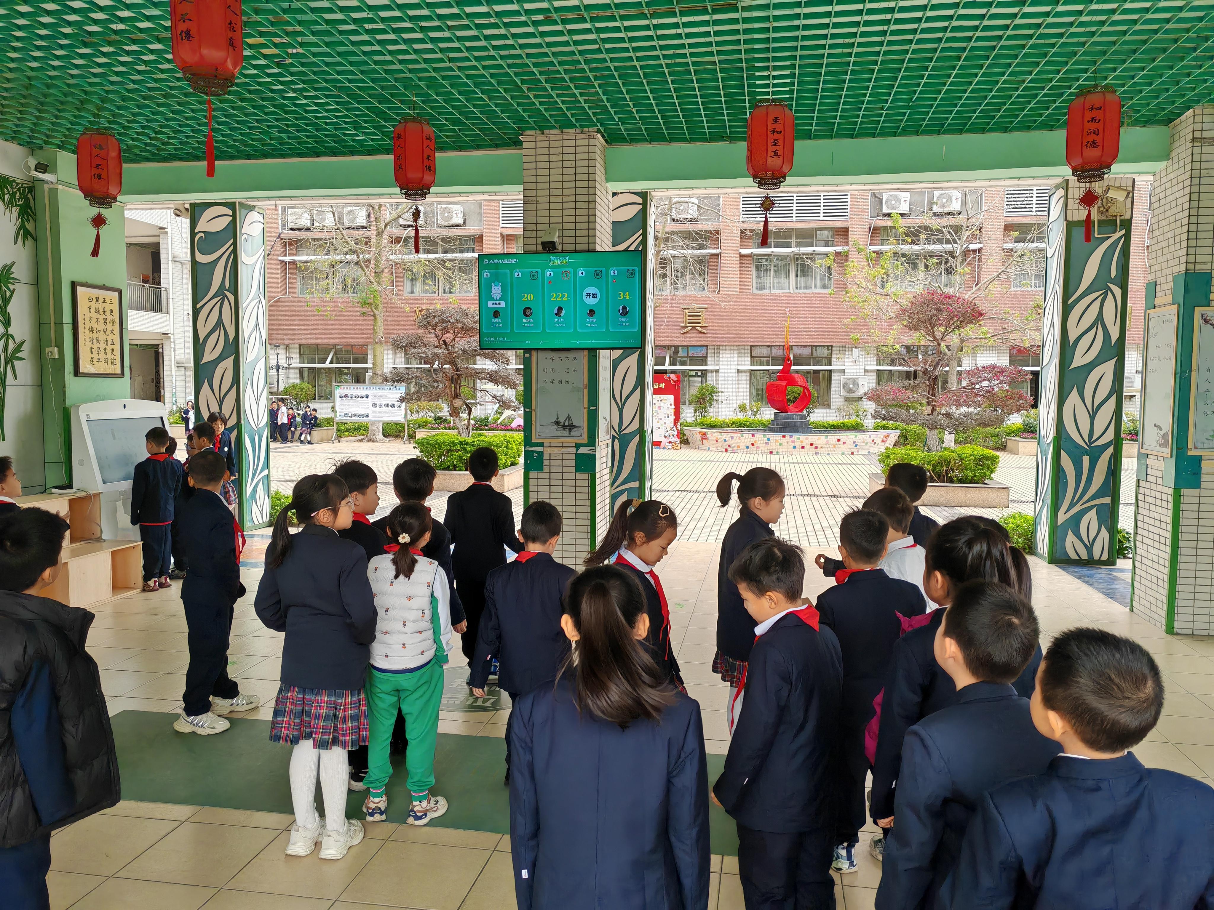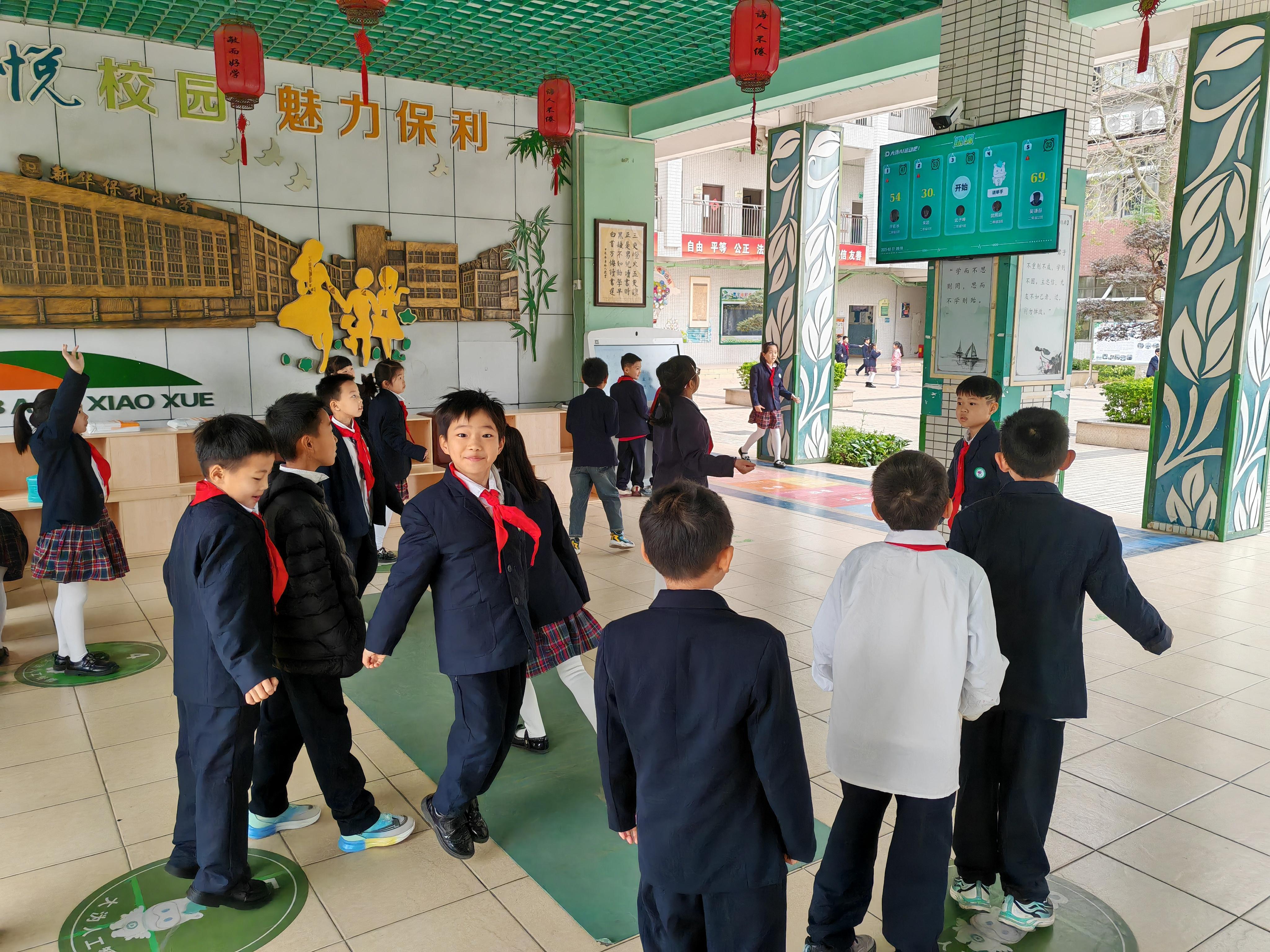 在广州市花都区秀全街和悦小学(以下简称“和悦小学”)篮球场上,高年级的同学们正尽情挥洒汗水。只见一名同学灵活地运球,迅速突破对手防线,高高跃起,篮球在空中划过一道漂亮的弧线,精准落入篮筐,引得周围同学阵阵欢呼。不远处的 AI 体育设施旁,围满了好奇的同学。只见屏幕上闪烁着各种有趣的互动游戏画面,一位同学正对着屏幕里做着新奇的动作,时而快速下蹲,时而敏捷跳跃,引得周围同学哈哈大笑,大家你一言我一语,迫不及待地交流着游戏技巧