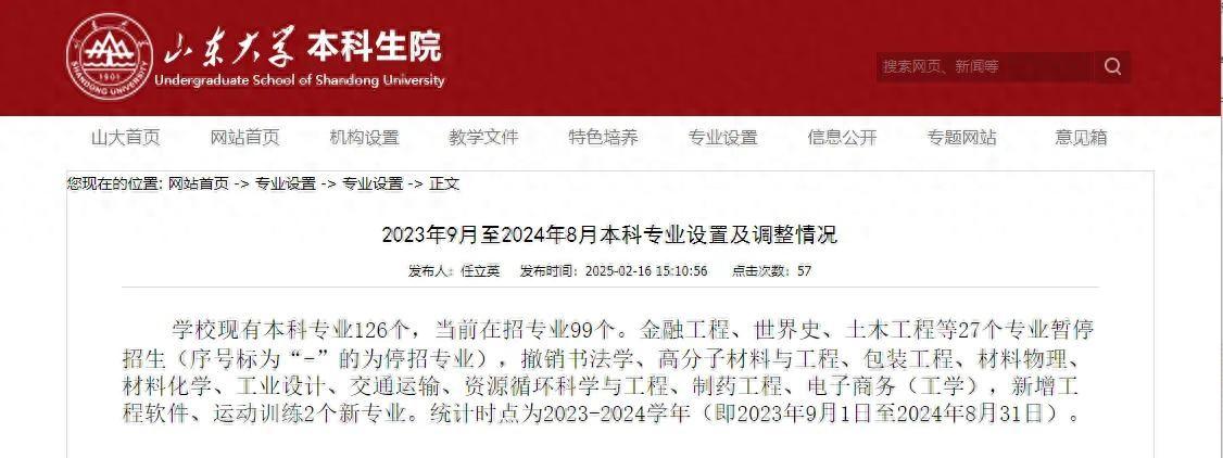 2月16日,山东大学发布《2023年9月至2024年8月本科专业设置及调整情况》,其中提到:金融工程、世界史、土木工程等27个专业暂停招生。
