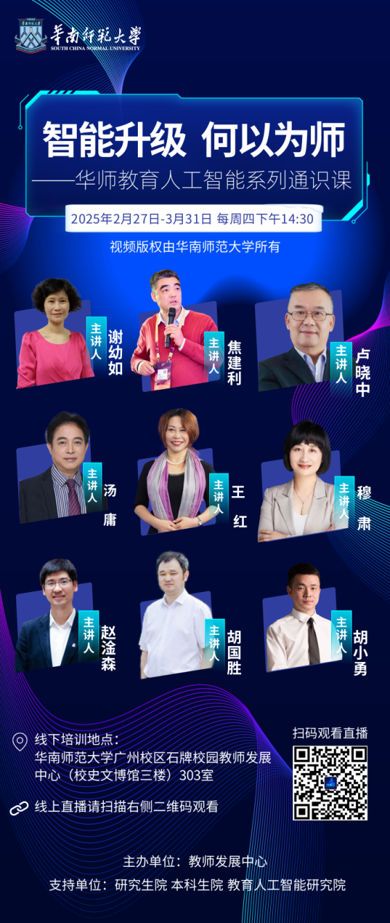 DeepSeek具备低耗能、开源性、本土化三大重要特征。此次华南师范大学组织的系列通识课与之有异曲同工之妙:所有讲座都以线上线下相融合的低耗能方式覆盖“三校区、四校园”;所有内容均以直播方式向校内外广大教师共享;所有主讲专家均来自华南师范大学名师队伍,以“华师声音”回应“智能升级、何以为师”的时代之问。