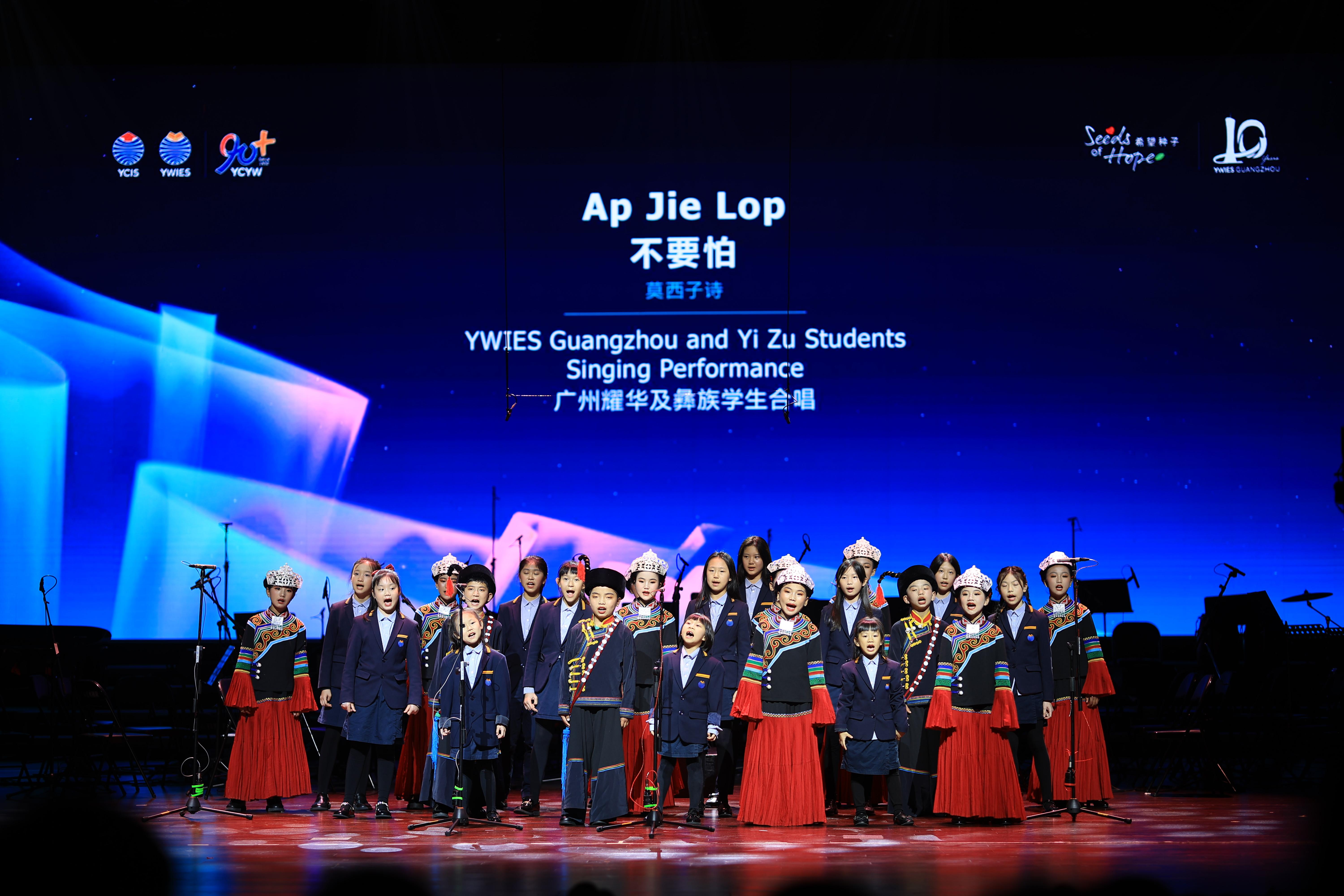 紧随月琴演奏的,是穗凉两地学子携手演绎的彝语歌曲《Ap Jie Lop不要怕》。广州耀华学生与彝族少年并肩而立,用纯净的歌声唱出“勇敢面对生活中的困难和挑战,不要害怕一路前行中的失败和挫折”。台下观众无不动容。