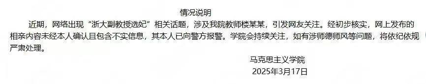 近期,网络出现“浙大副教授选妃”相关话题,涉及我院教师楼某某,引发网友关注。经初步核实,网上发布的相亲内容未经本人确认且包含不实信息,其本人已向警方报警。学院会持续关注,如有涉师德师风等问题,将依纪依规严肃处理。