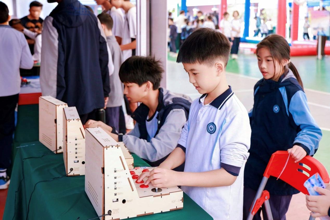 此次科技节通过为期六周的课程融合实践与创新成果展示,为小学、初中、高中三个学段的1200多名学生搭建了阶梯式科技探索平台。活动现场依据不同学段划分成三大展区,共展出44项学生STEAM项目作品,并引进18项科技类体验项目摊位,通过精心设计的差异化活动,激发学生对人工智能的兴趣与创造力,促进跨学科融合与创新实践。