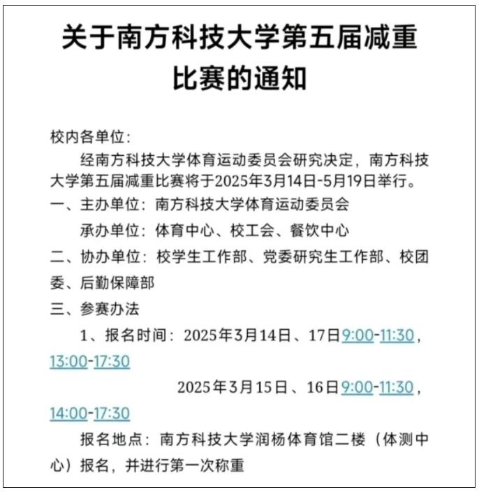 日前 在社交平台上有网友晒出南方科技大学第五届减重比赛通知。