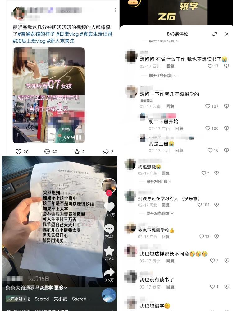 “10后辍学女孩日常vlog”“07女孩辍学打工励志买苹果手机”“勇敢的人先享受退学”......在多个短视频和社交平台检索“辍学”“退学”等关键词,也能发现一些疑似未成年人发布的辍学、退学vlog,有的还表示希望能通过做自媒体实现经济独立,给作品打上“新人求关注”等标签。