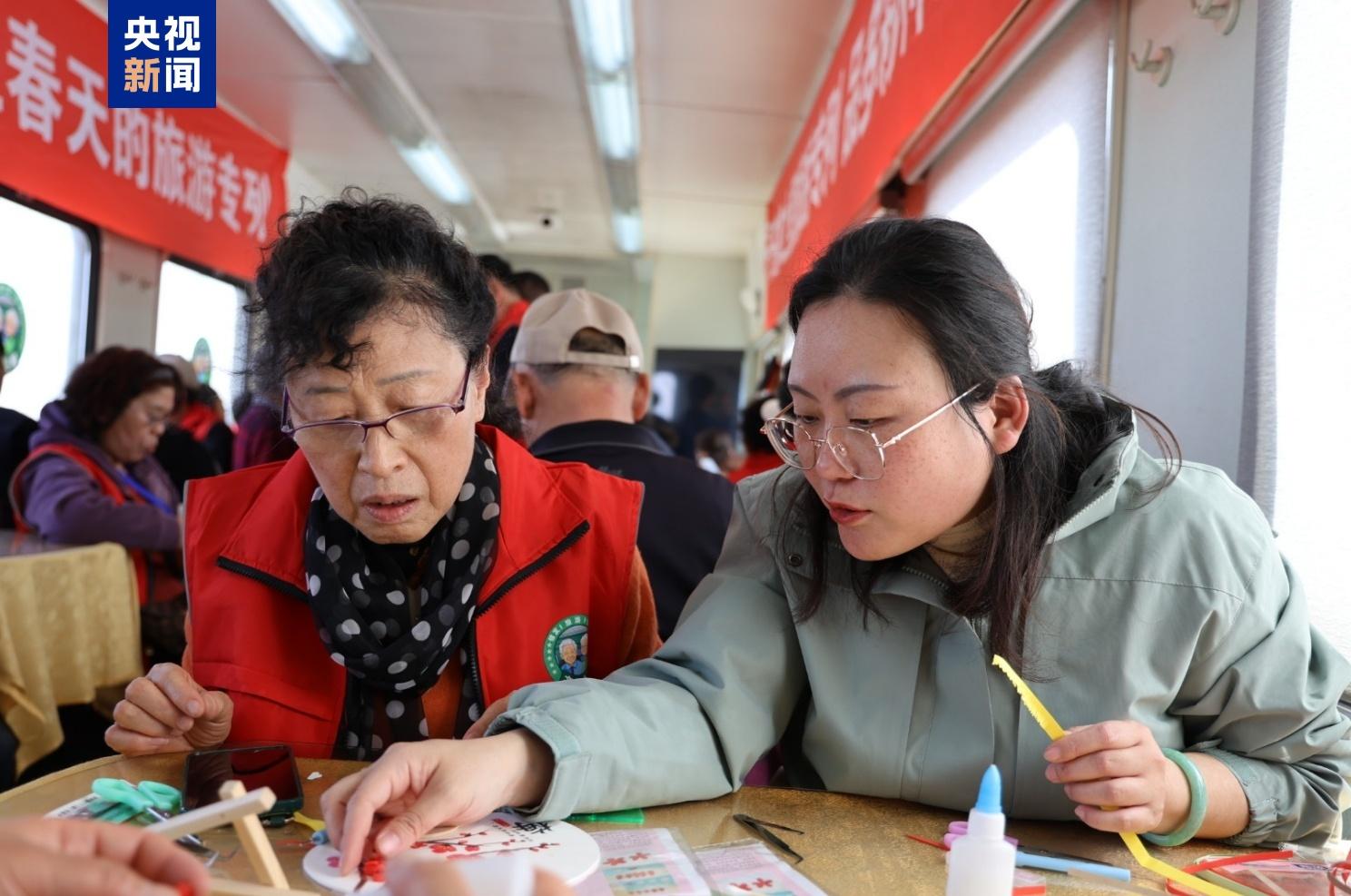 车厢里,老年朋友们展开棋牌大赛、体验手工制作、放声唱起老歌,让这所“移动的老年大学”充满了欢声笑语。