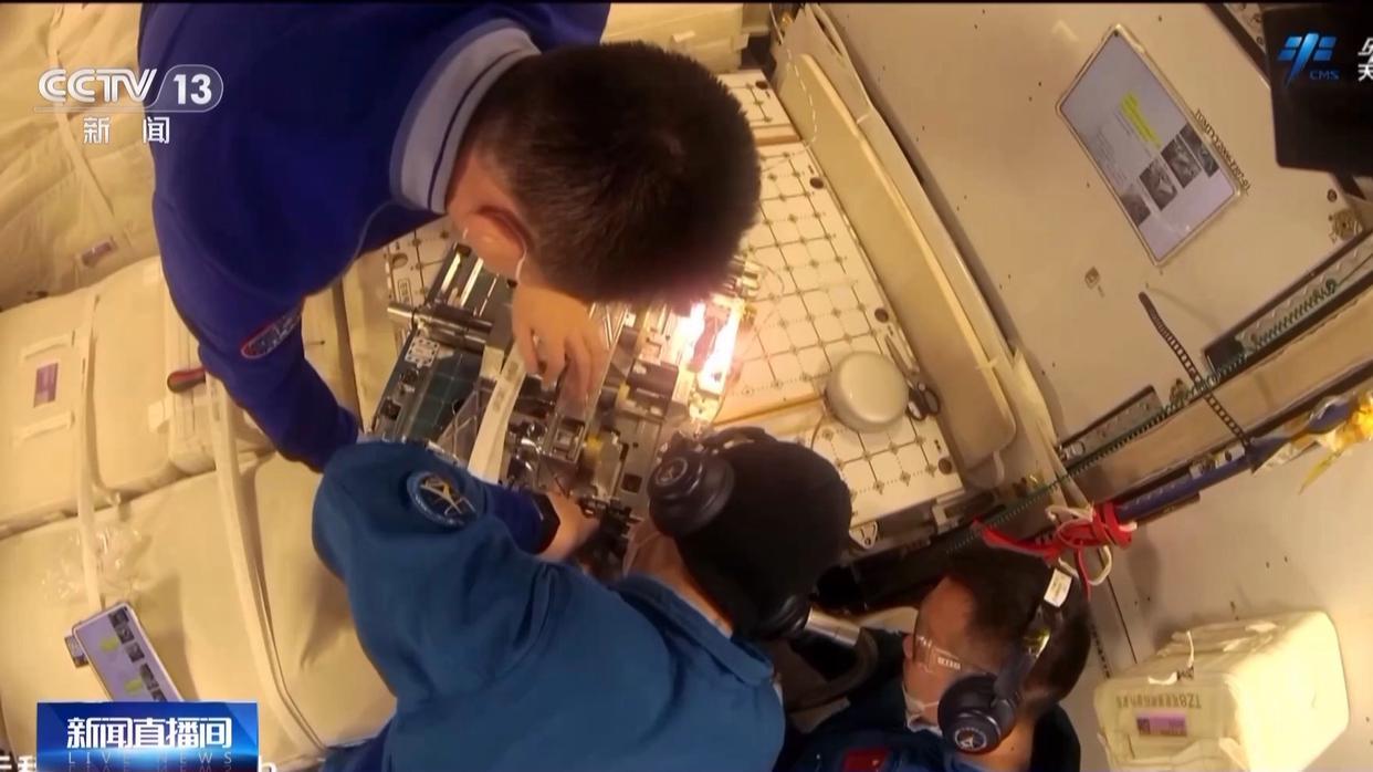 微重力物理科学领域多个实验项目持续进行中,乘组完成了流体物理实验柜及高温材料实验柜实验样品更换、抽真空排废气等多项工作。