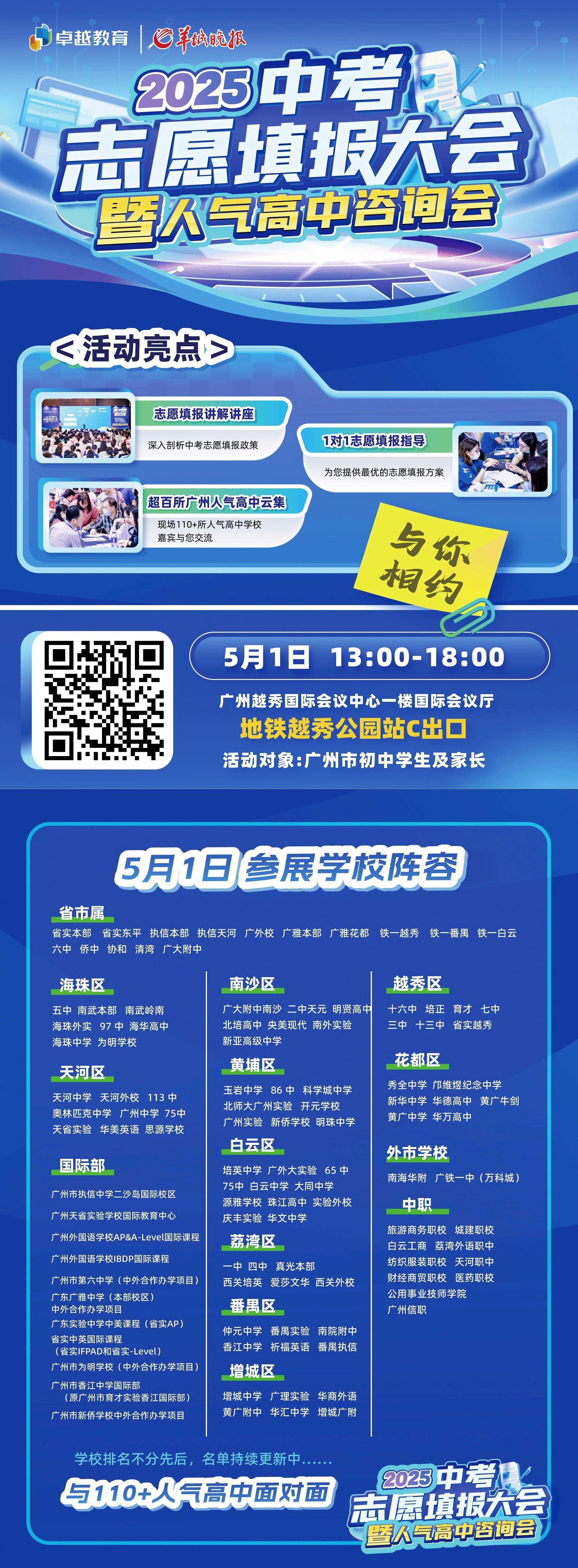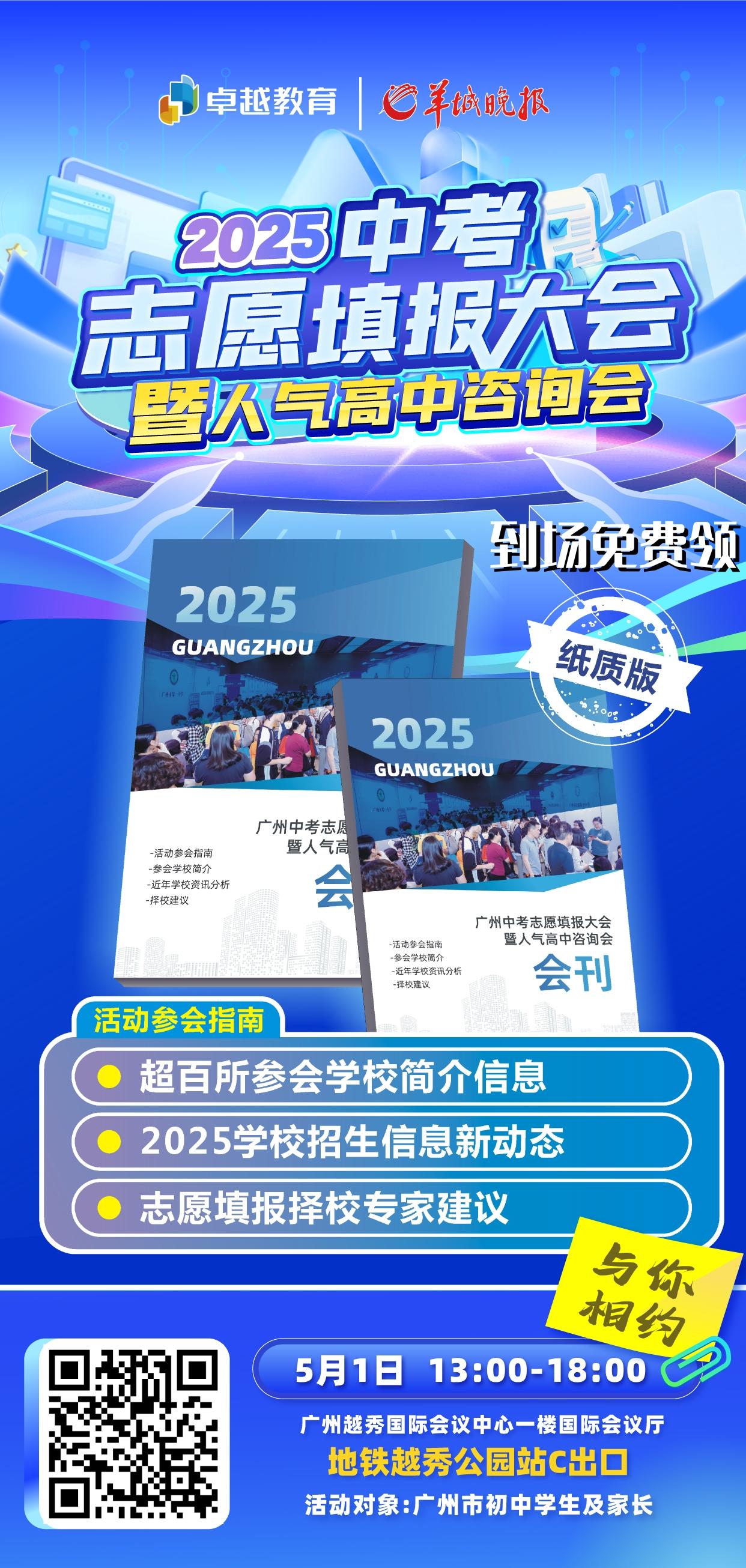 5月1日活动当天,羊城晚报将直击采访省实、广雅、广外等 TOP17 人气高中,全程直播——深入解读招生政策、特色班型!现场设有少量座席,家长可以扫码报名,到现场了解第一手资讯。