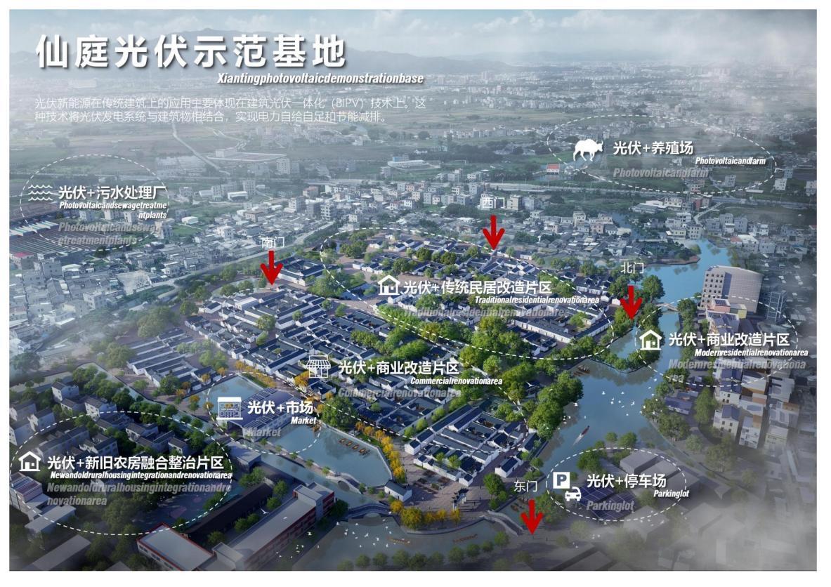 王河院士团队设计方案以“和美仙庭”为主题,深入探寻岭南传统村落与自然环境和谐共生的智慧结晶。设计团队从古老建筑布局、独特空间形态到精妙生态适应策略全方位汲取传统村落风貌的精髓,以整个村落为有机整体,充分发挥光伏技术的关键作用,精心塑造出一个绿色生态蓬勃发展、历史文化底蕴深厚、各类资源协同共生、产业经济活力涌动与百姓生活祥和幸福紧密相融的新农村典范风貌。