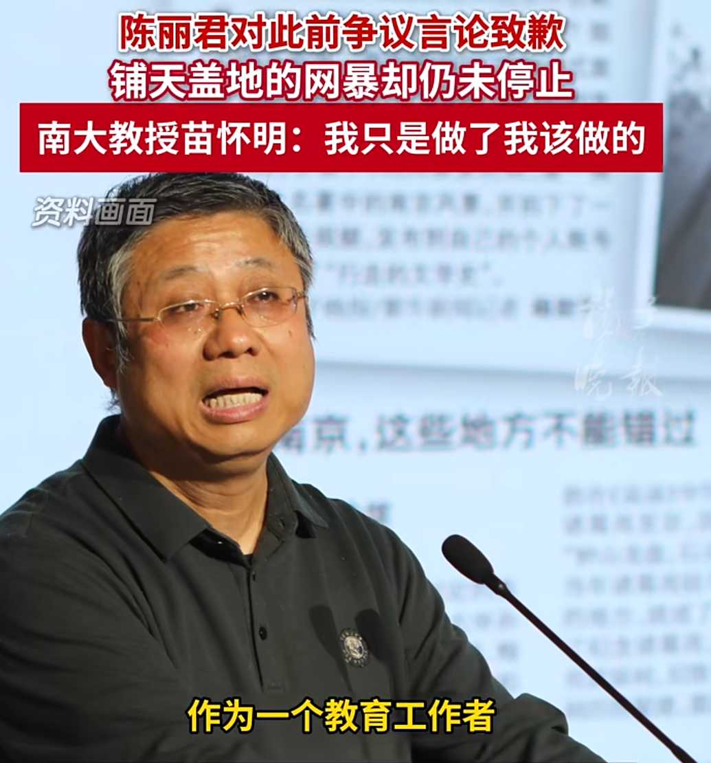 5月7日,江苏省红楼梦学会会长、南京大学文学院教授苗怀明在接受采访时表示“被各种问候祖宗十八代。铺天盖地的网暴,直到陈丽君致歉也没有停止。”