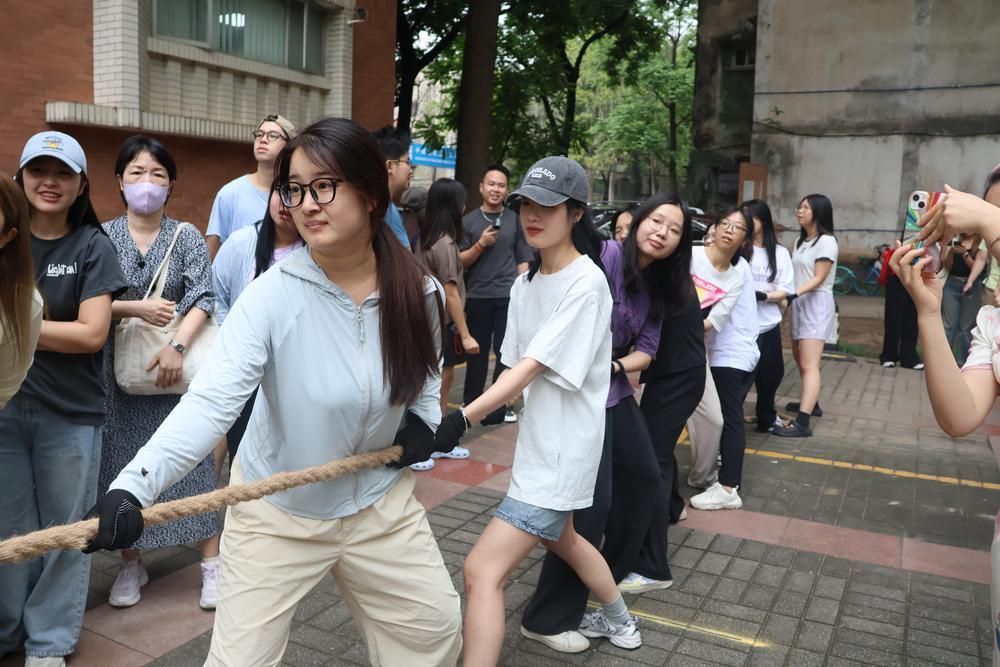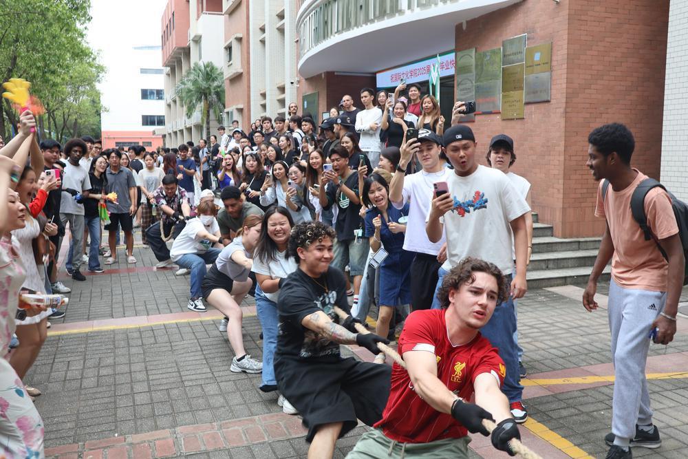 赛前,华南师范大学国际交流合作处副处长赵頔表示,希望所有参赛选手在拔河比赛中挥洒汗水,感受中华文化“和合共生”的价值理念。随后,主持人介绍本次比赛的参赛队伍、比赛规则及注意事项。拔河比赛正式开始后,现场加油声、呐喊声交织在一起,每支队伍都展现出超强的团队凝聚力,中外学生也在这场拔河比赛中充分感受到了跨国界的团结力量。