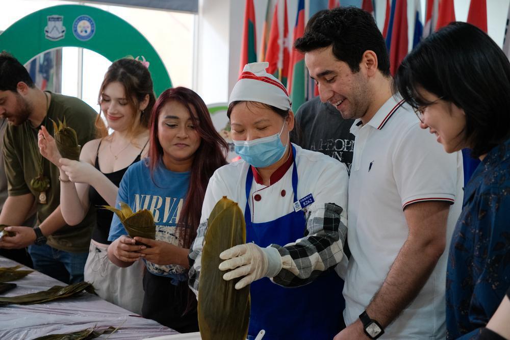 拔河比赛结束后,华南师范大学国际文化学院还开展了端午文化体验活动。活动伊始,国际文化学院院长金檀为学院师生送上了端午祝福,印度尼西亚籍留学生洪皜郇演唱了《青花瓷》,主持人还邀请中外学生体验包粽子,让大家沉浸式领略中华传统文化的魅力。